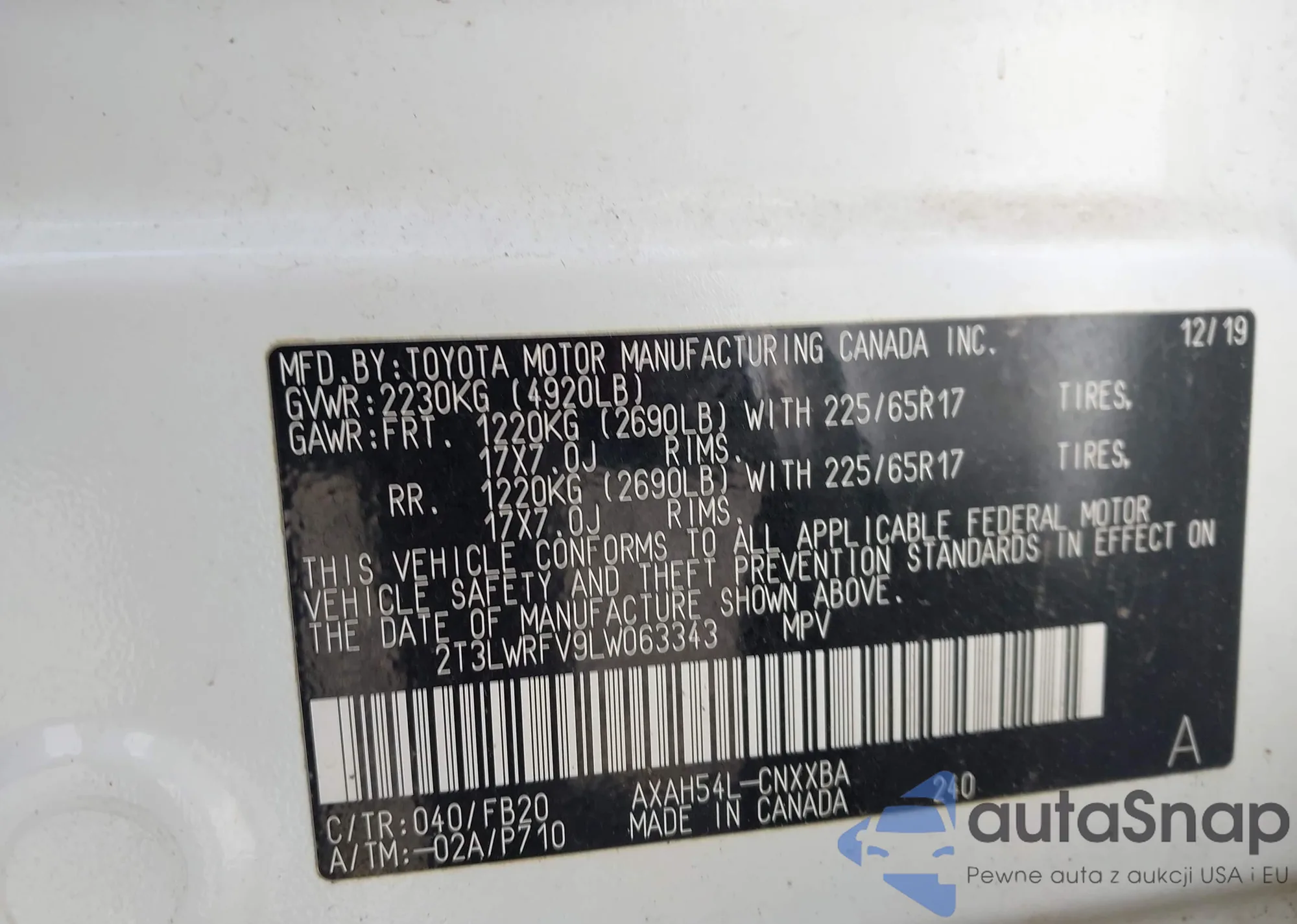 LOT: 43761384 VIN: 2T3LWRFV9LW063343