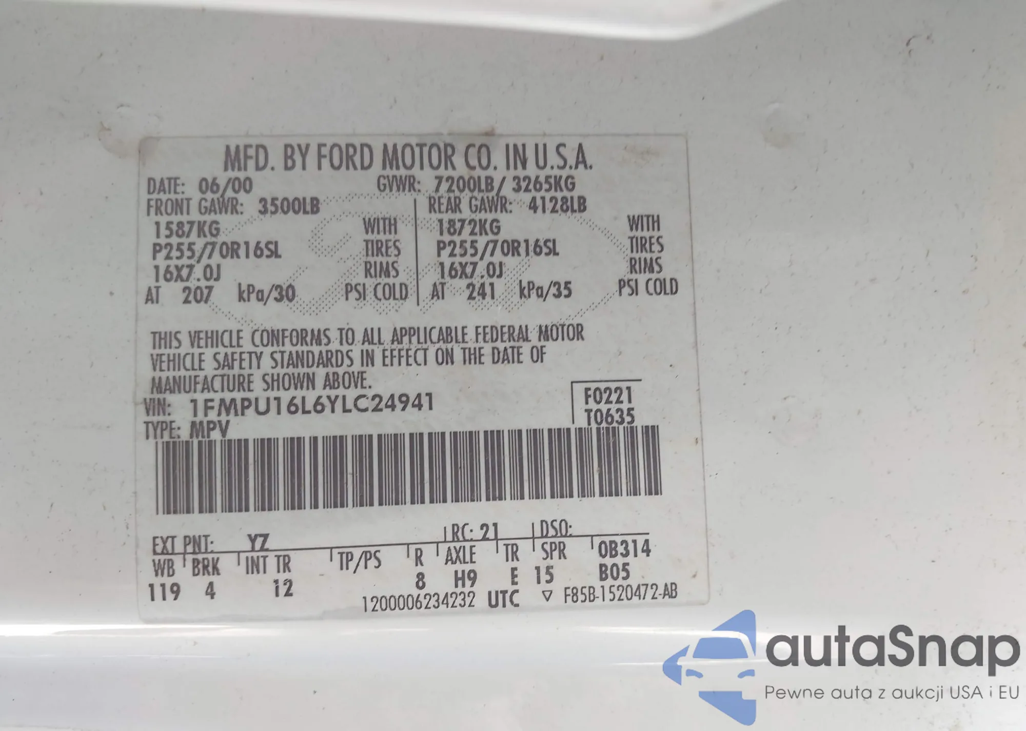 LOT: 43633843 VIN: 1FMPU16L6YLC24941