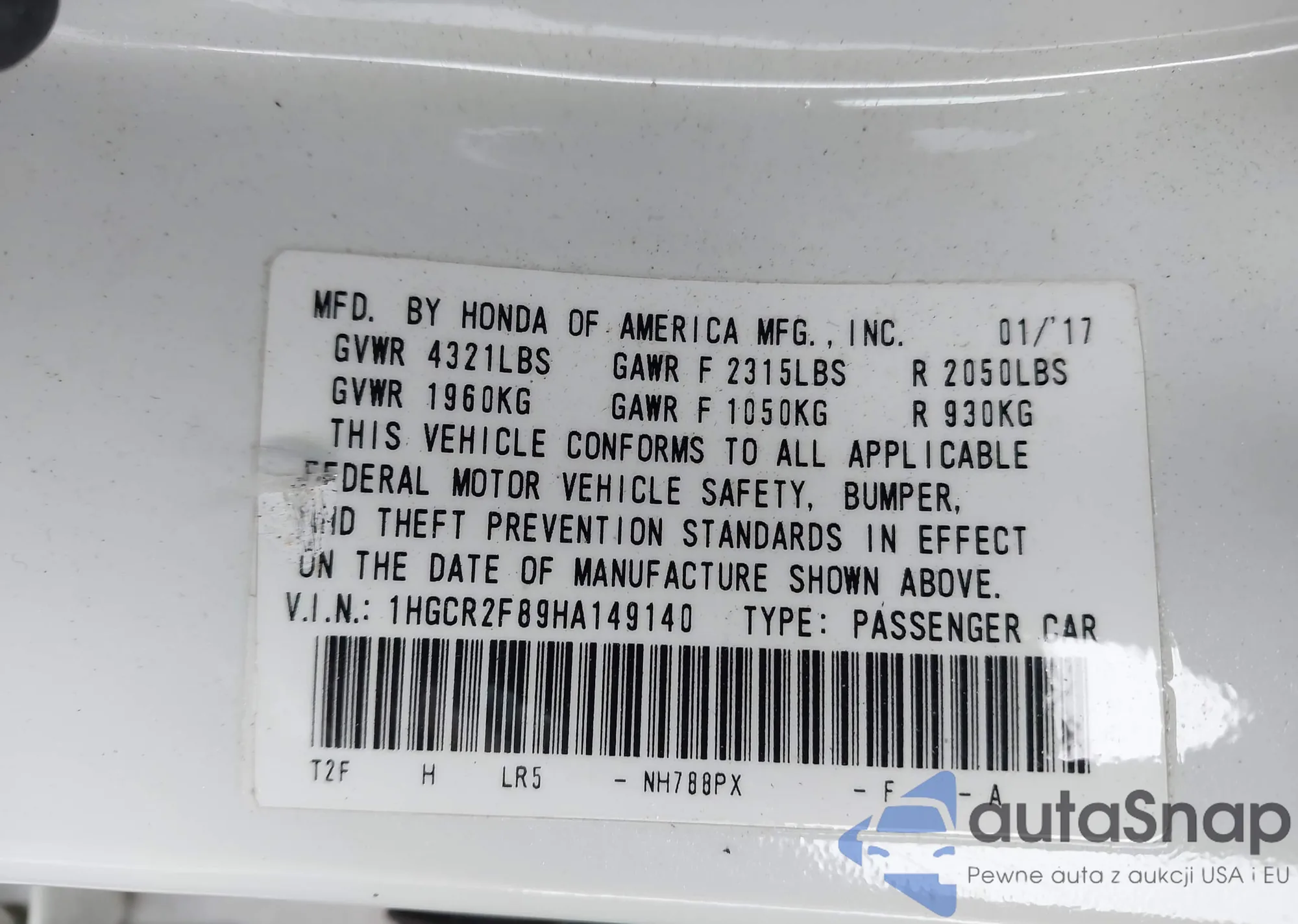 LOT: 43720678 VIN: 1HGCR2F89HA149140