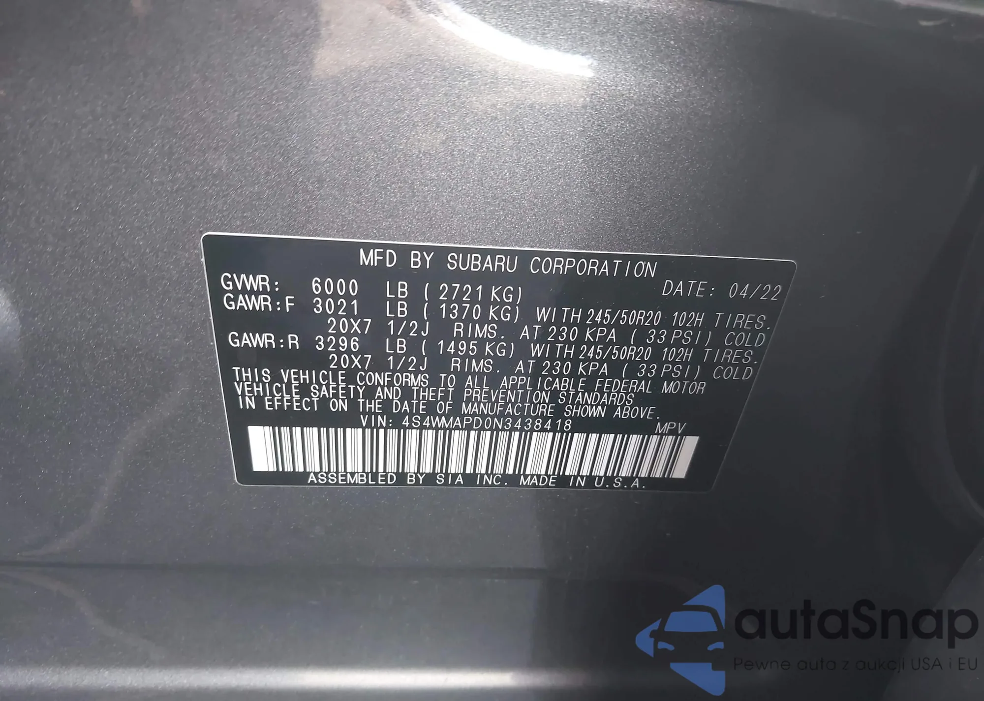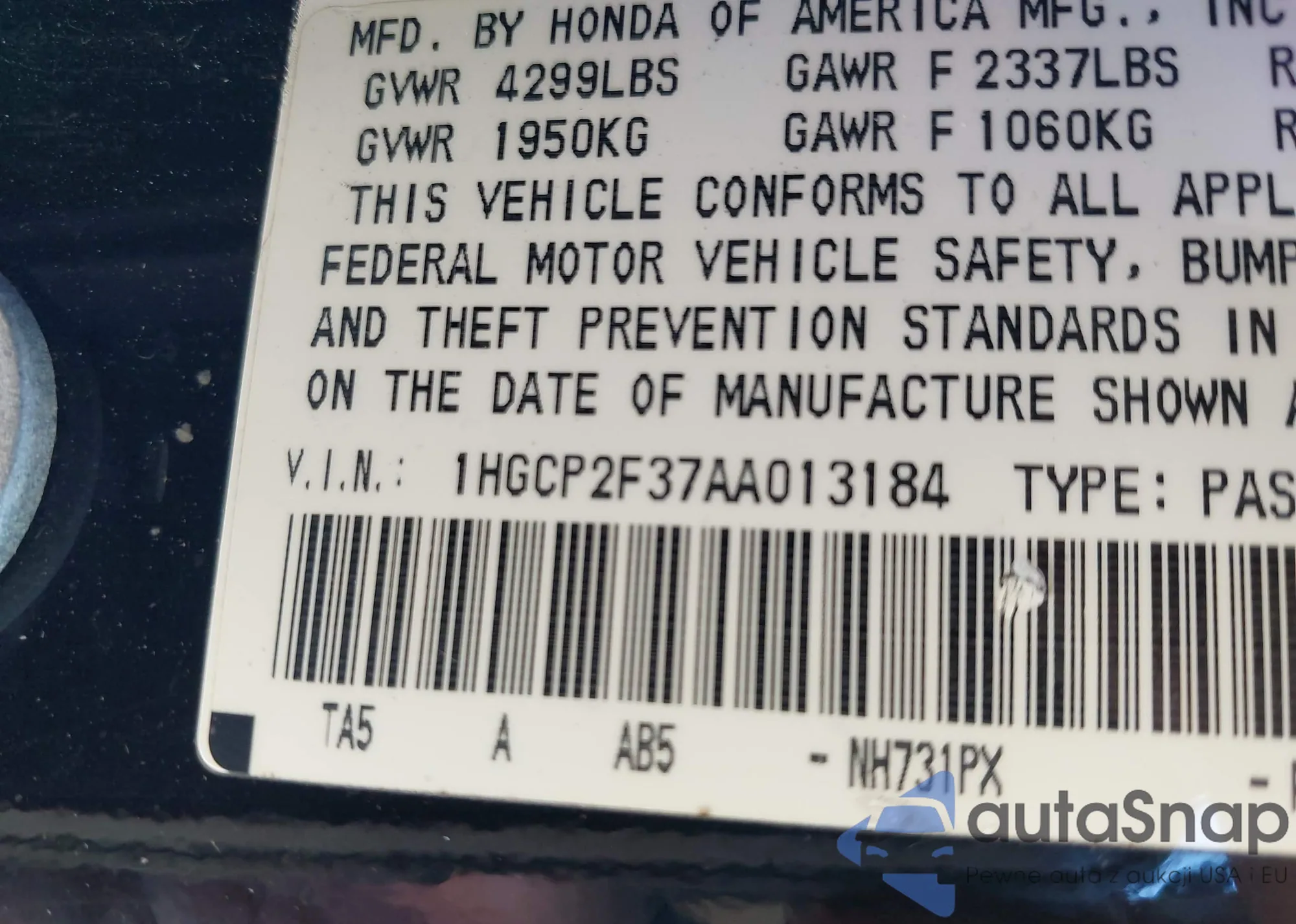 LOT: 38591271 VIN: 1HGCP2F37AA013184