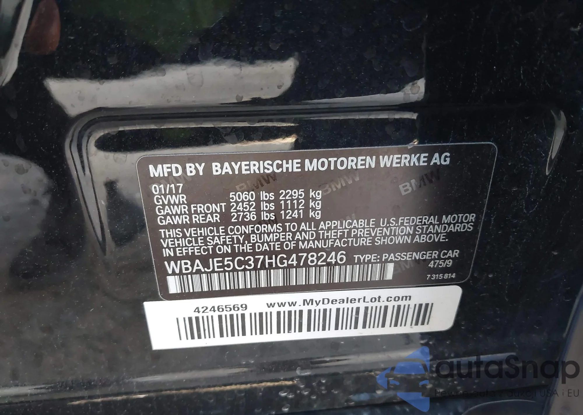 LOT: 43730304 VIN: WBAJE5C37HG478246