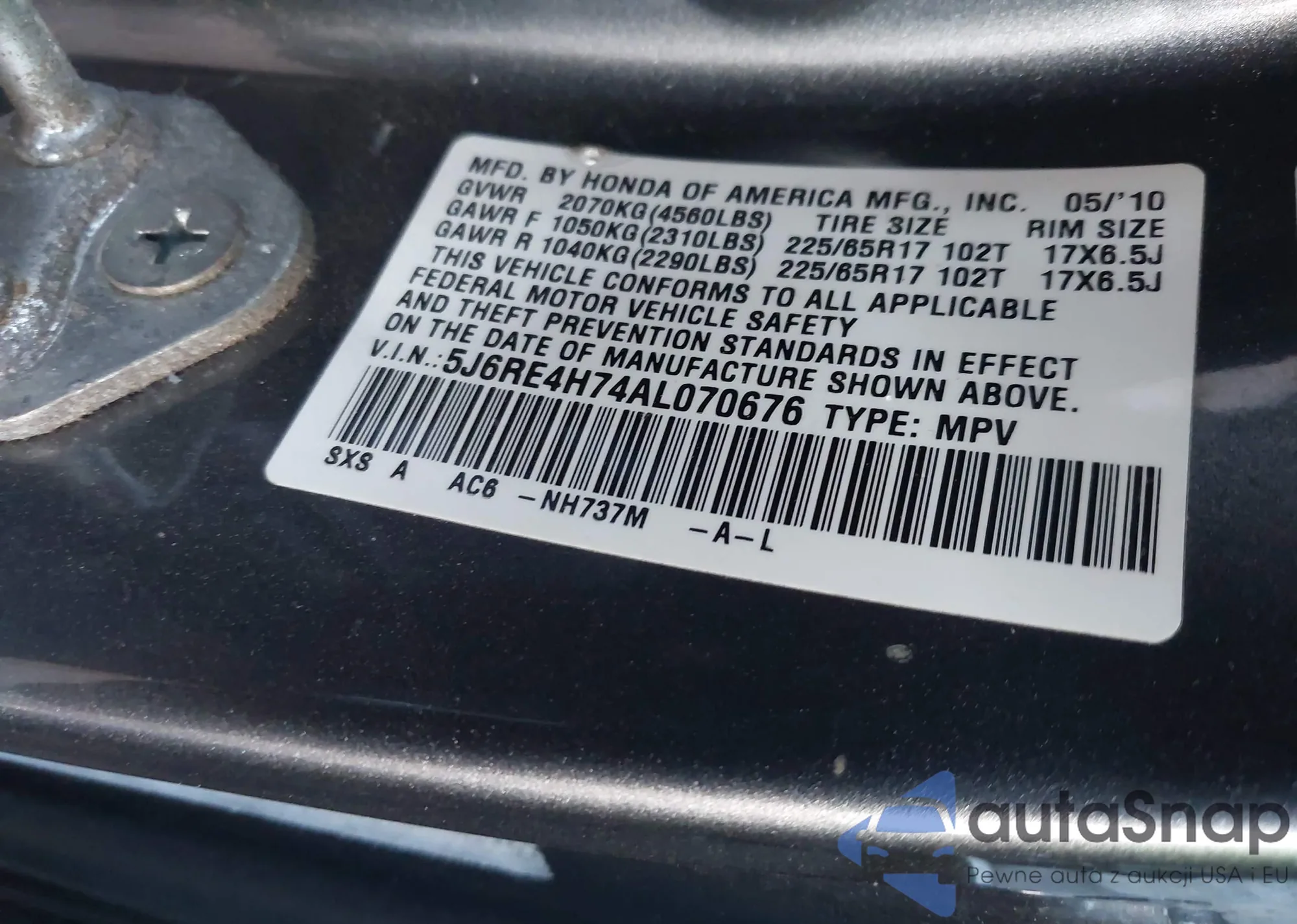 • VIN 5J6RE4H74AL070676