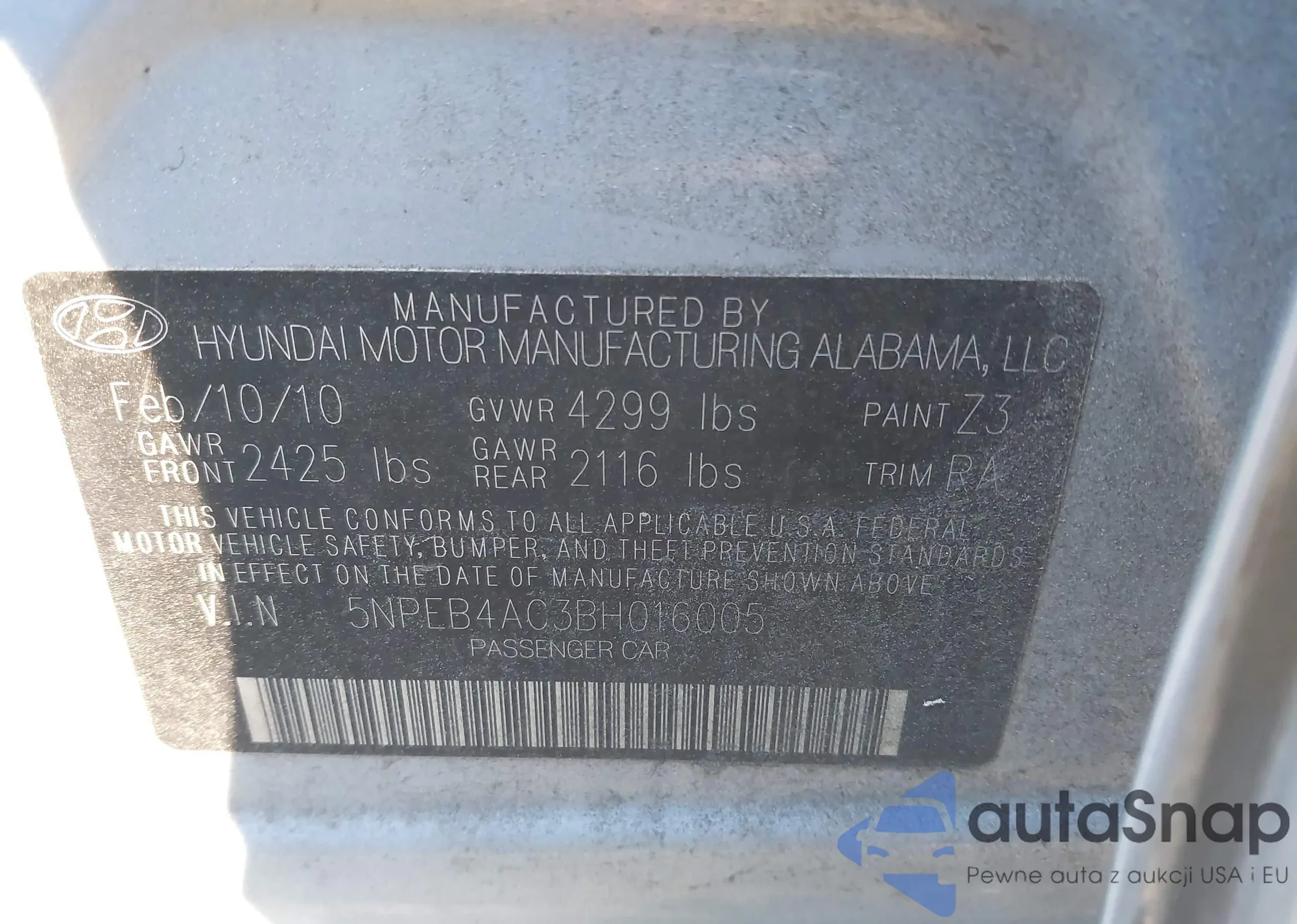 LOT: 43949967 VIN: 5NPEB4AC3BH016005