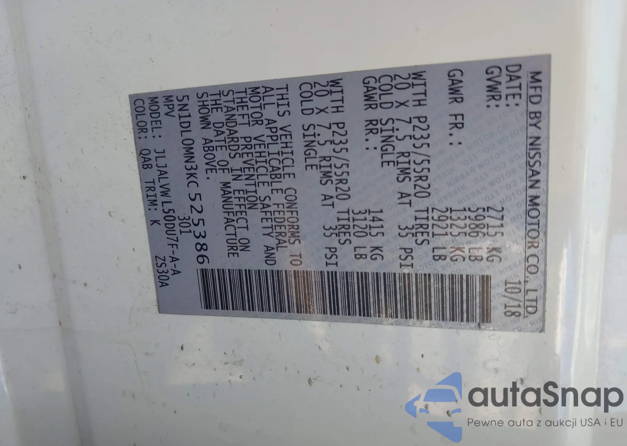 LOT: 43586896 VIN: 5N1DL0MN3KC525386