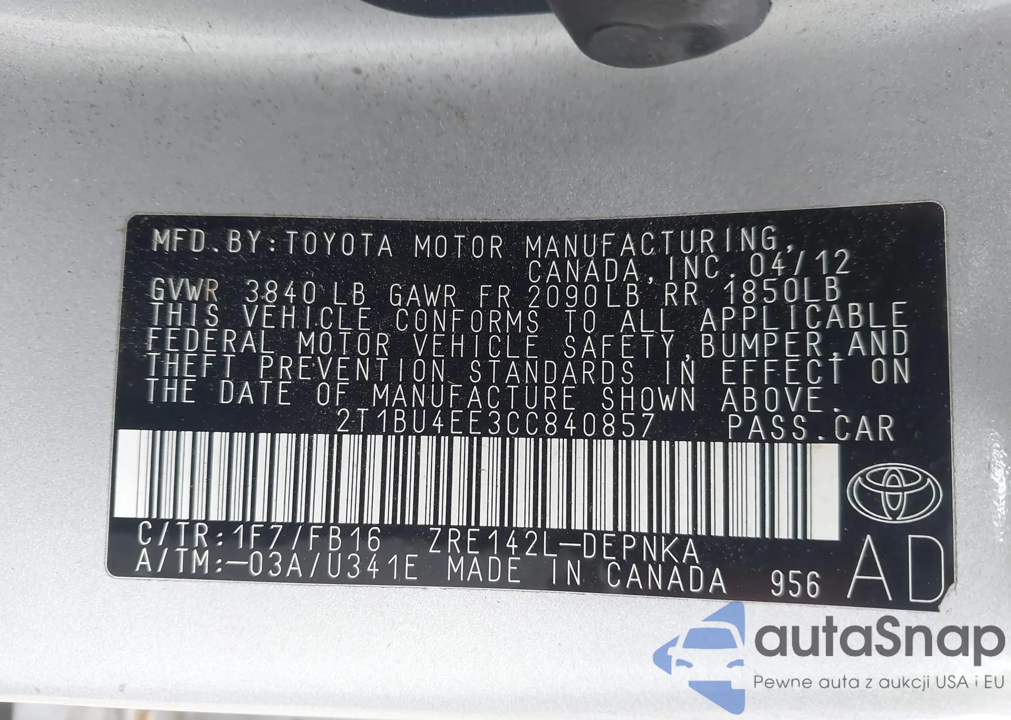 • VIN 2T1BU4EE3CC840857
