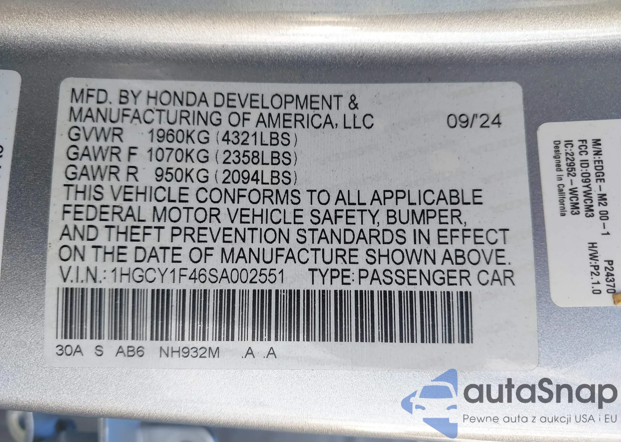 • VIN 1HGCY1F46SA002551