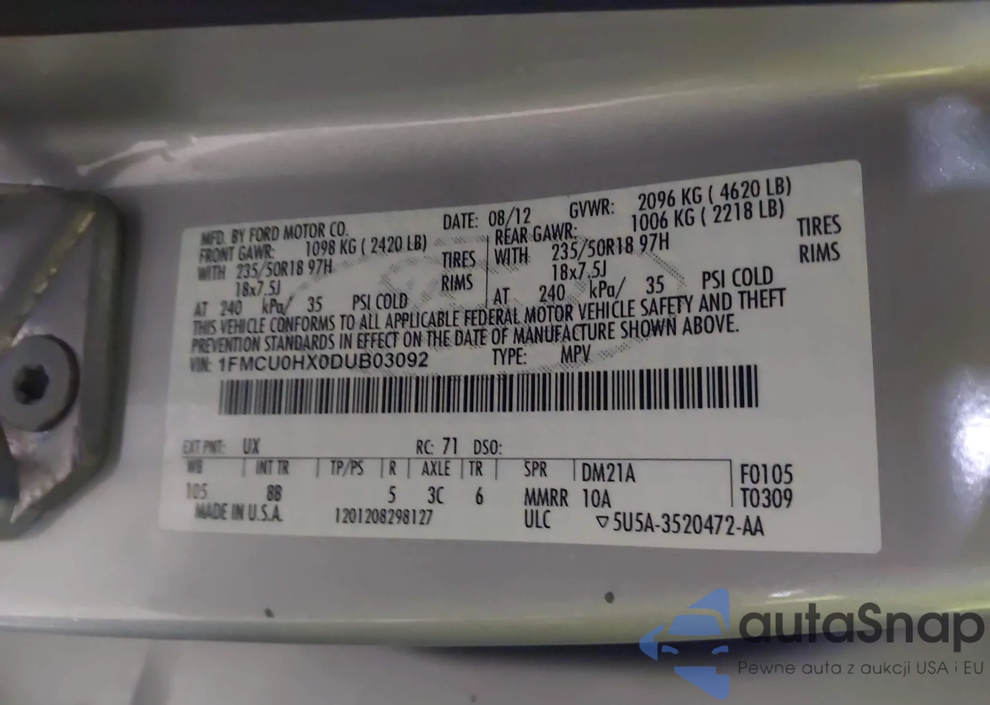 • VIN 1FMCU0HX0DUB03092