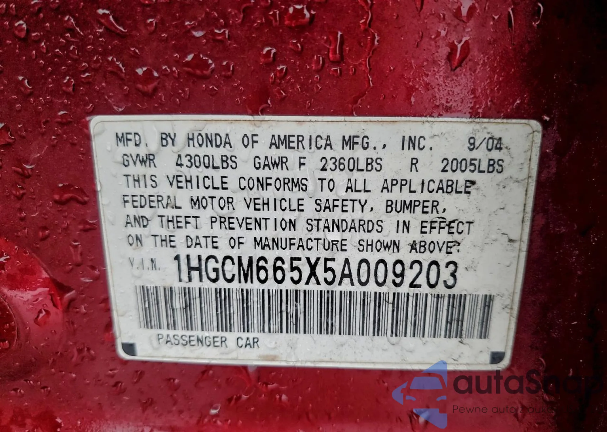 LOT: 93155715 VIN: 1HGCM665X5A009203
