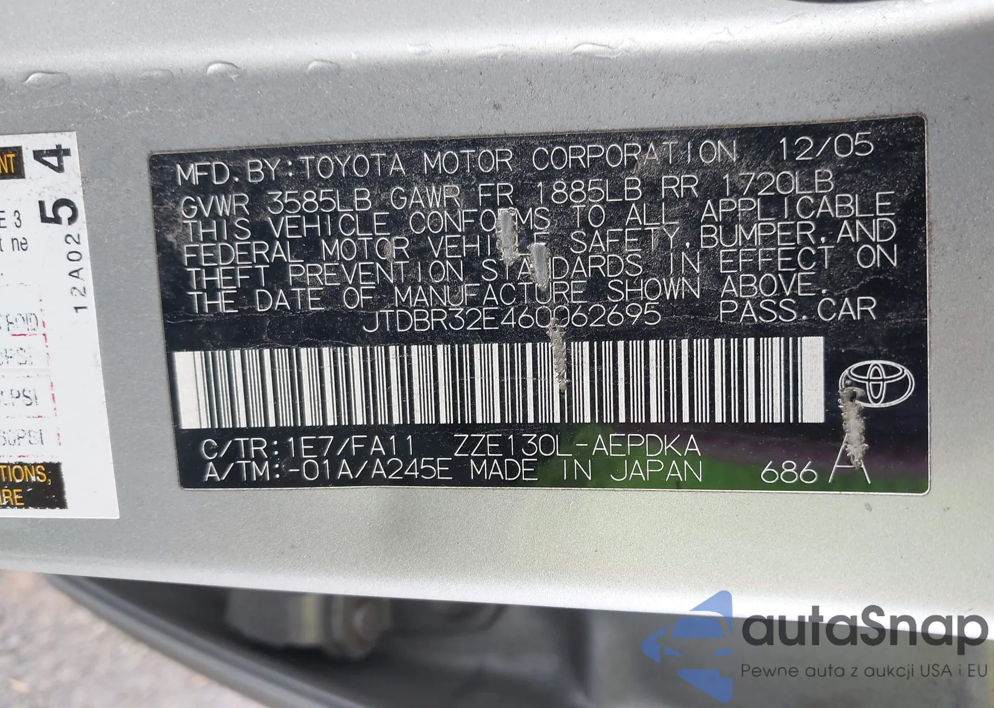 LOT: 43663885 VIN: JTDBR32E460062695