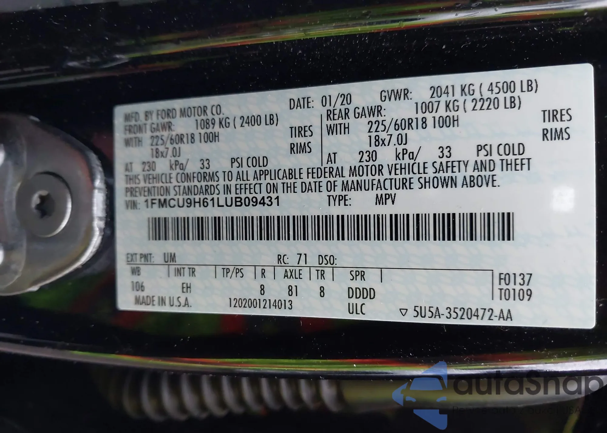LOT: 43805941 VIN: 1FMCU9H61LUB09431