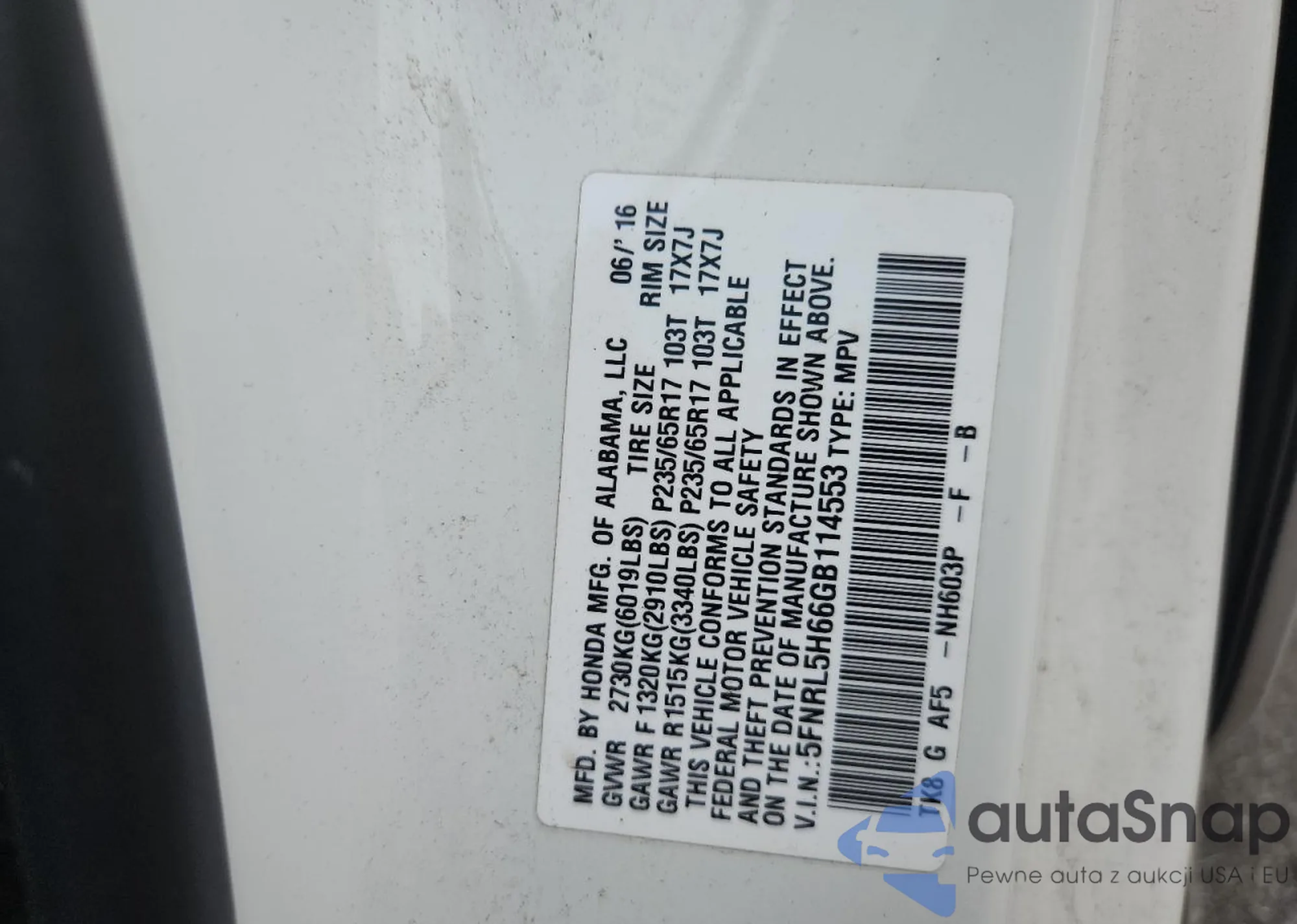 • VIN 5FNRL5H66GB114553