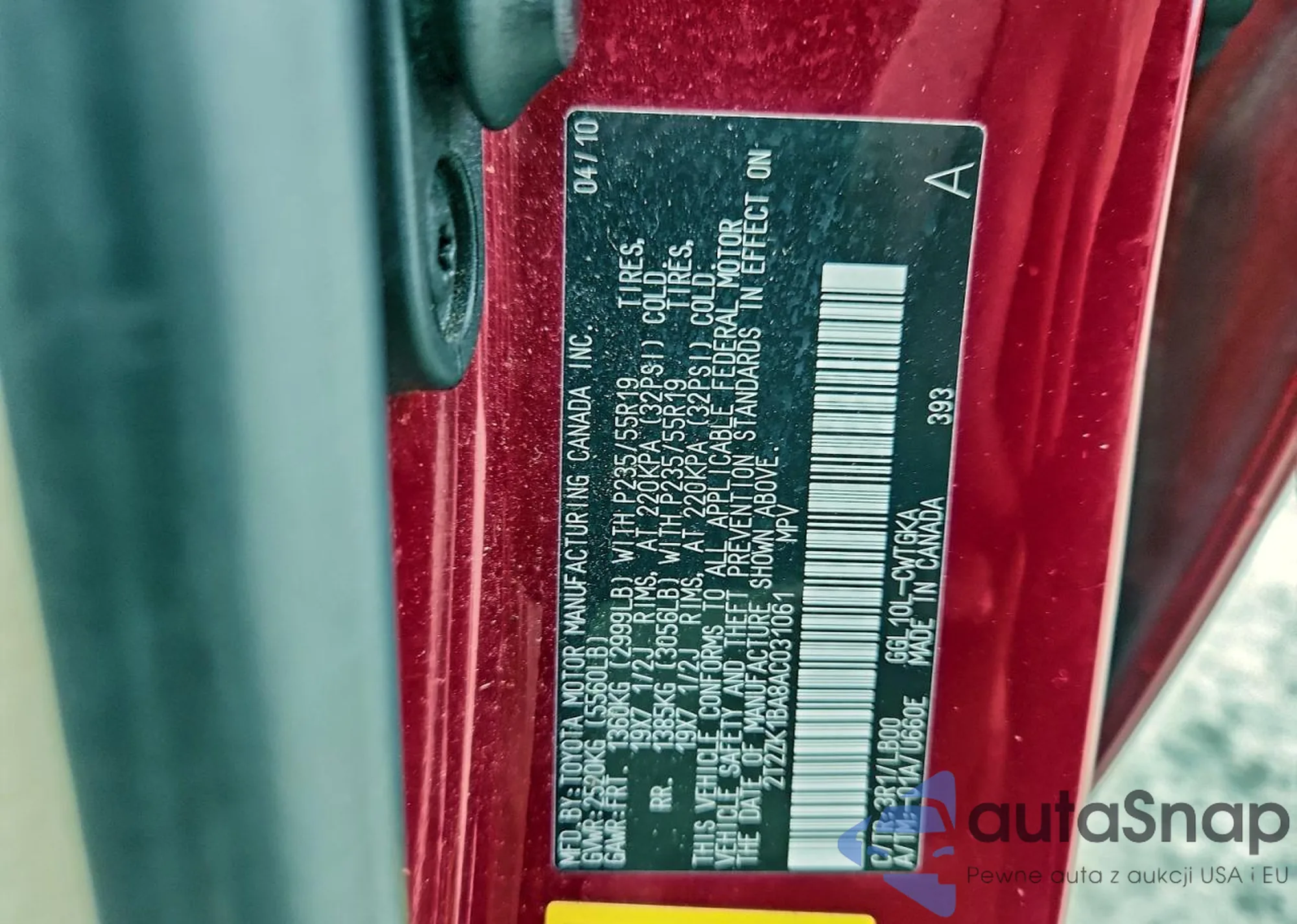 • VIN 2T2ZK1BA8AC031061