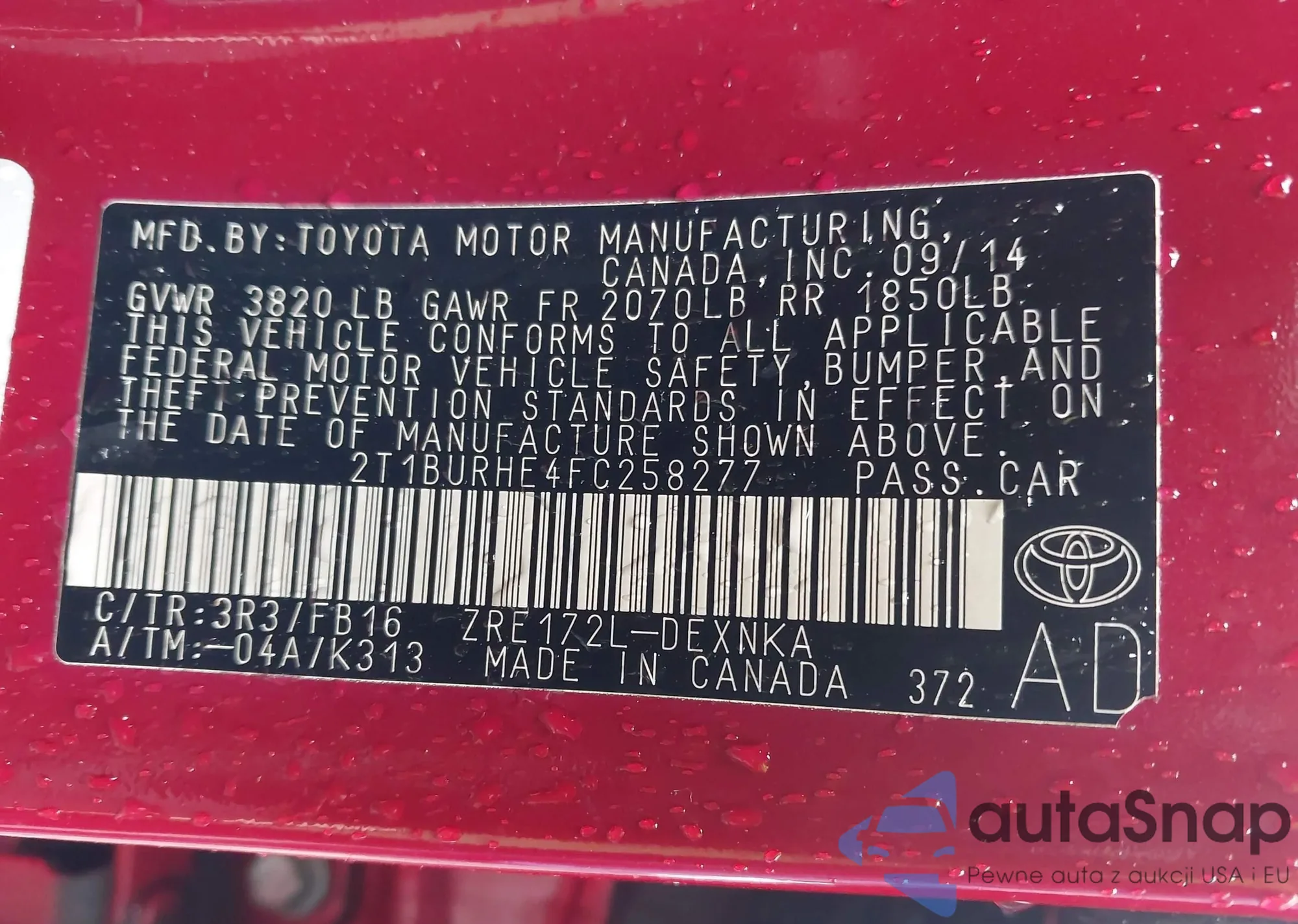 LOT: 43415534 VIN: 2T1BURHE4FC258277