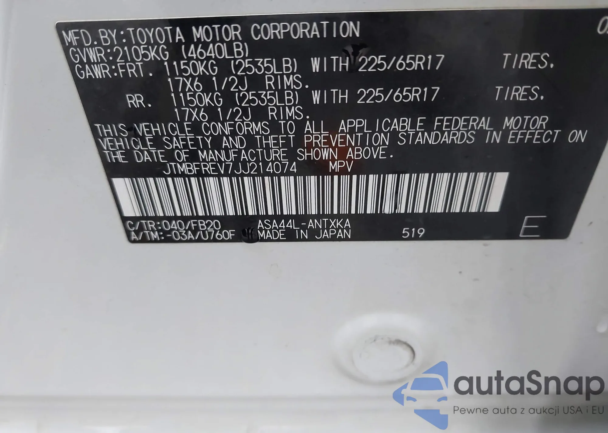 LOT: 43776509 VIN: JHLRE48717C071138