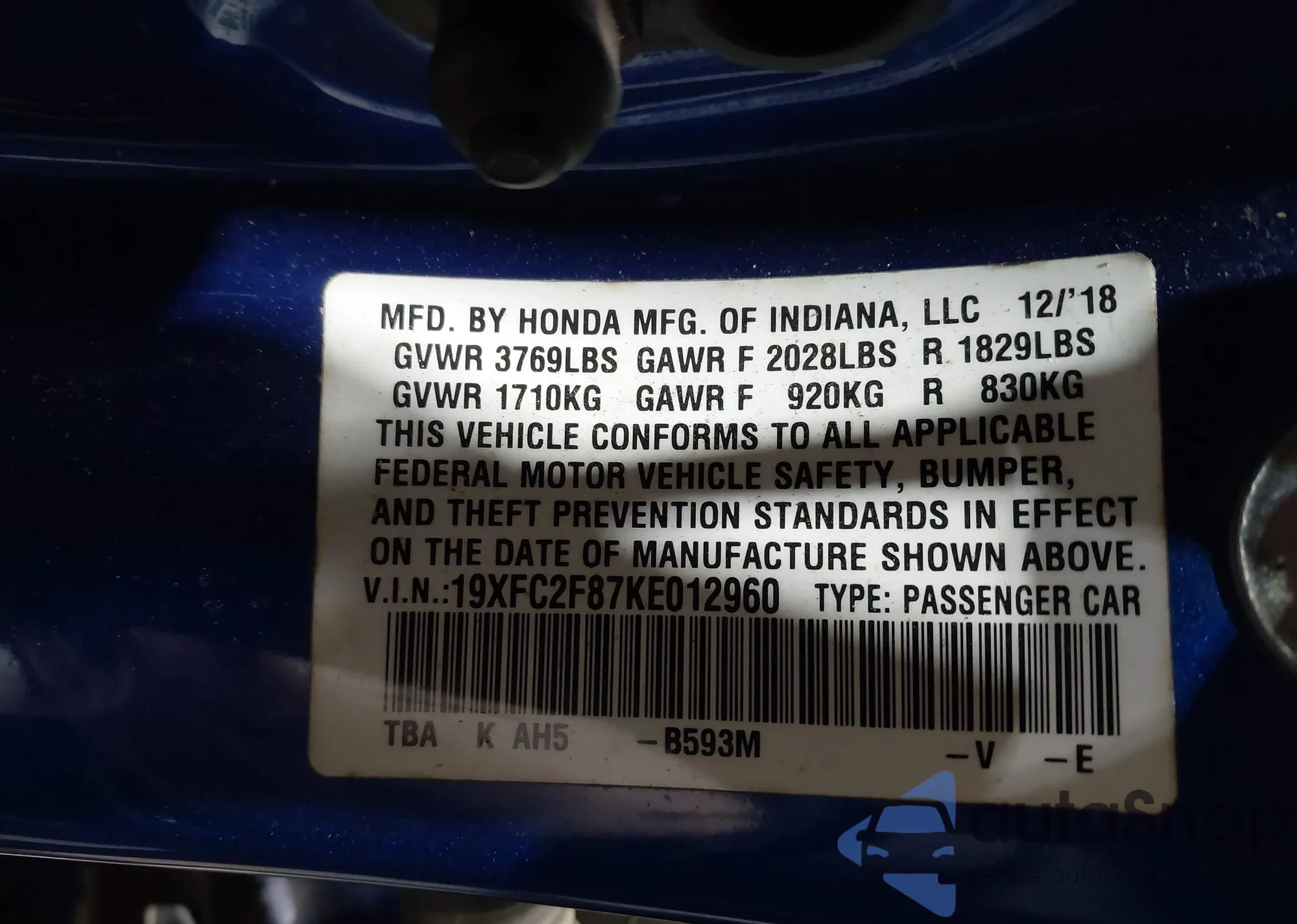 • VIN 19XFC2F87KE012960