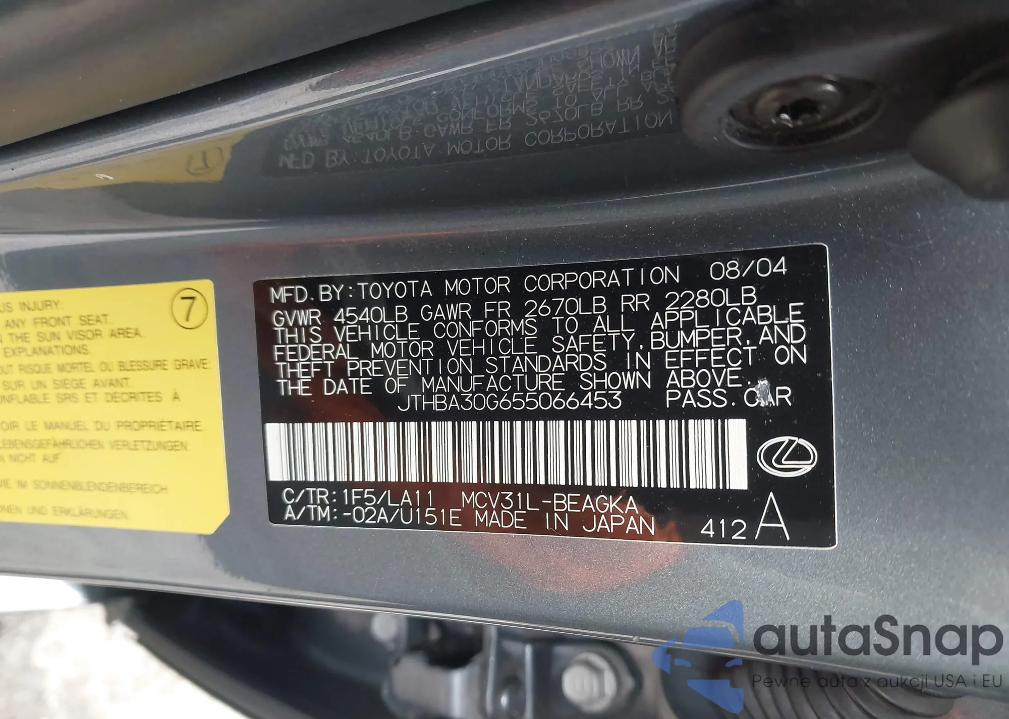 LOT: 43661296 VIN: JTHBA30G655066453