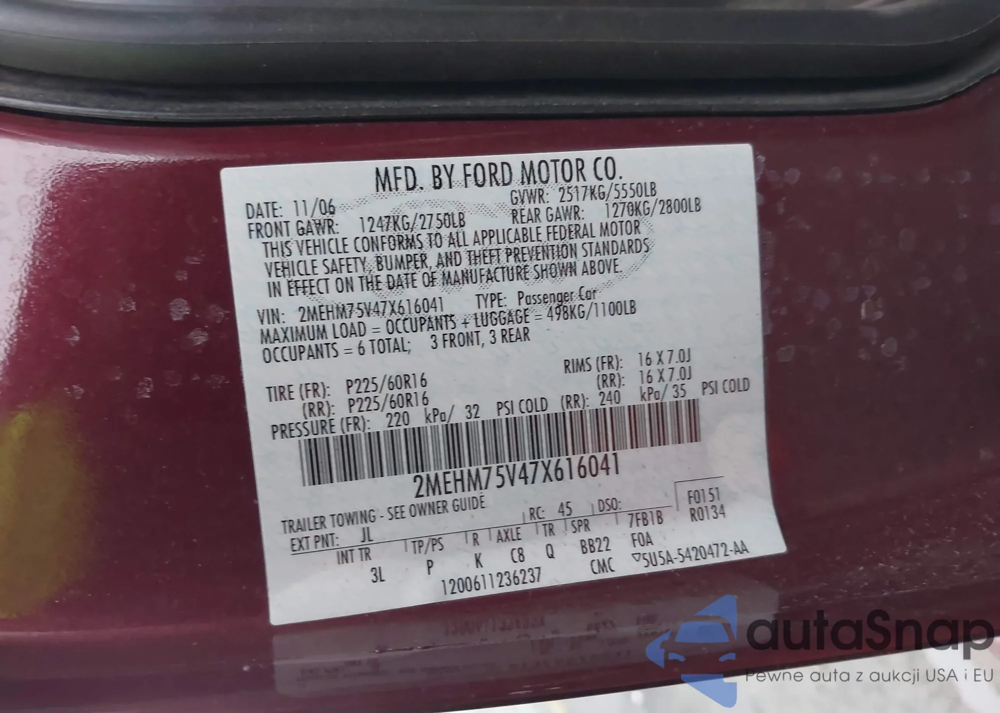 LOT: 94181265 VIN: 5FNYF28766B024375