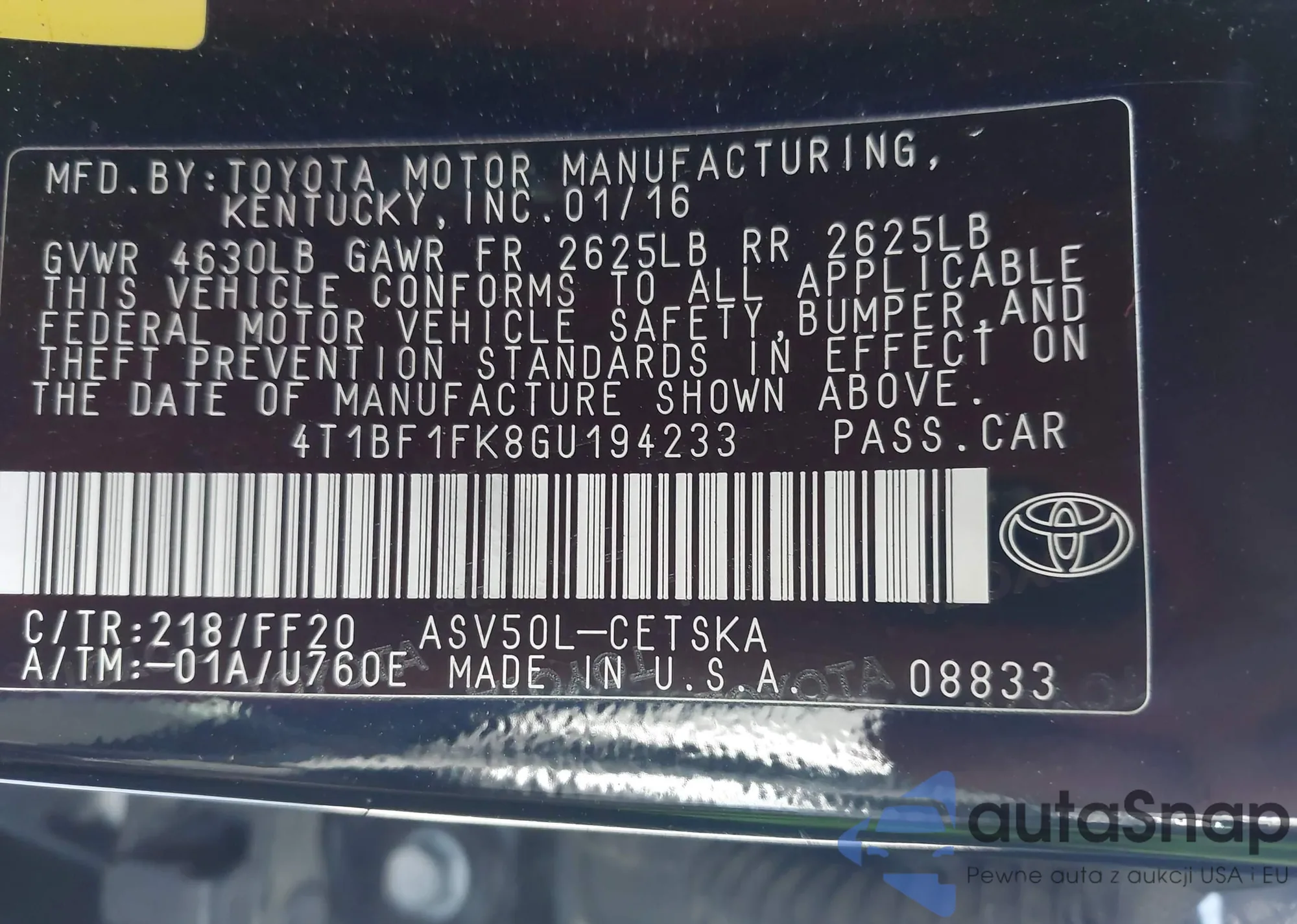 • VIN 4T1BF1FK8GU194233