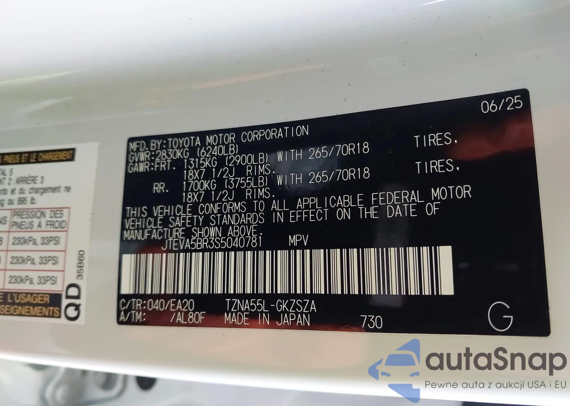 LOT: 43441456 VIN: JTEVA5BR3S5040781