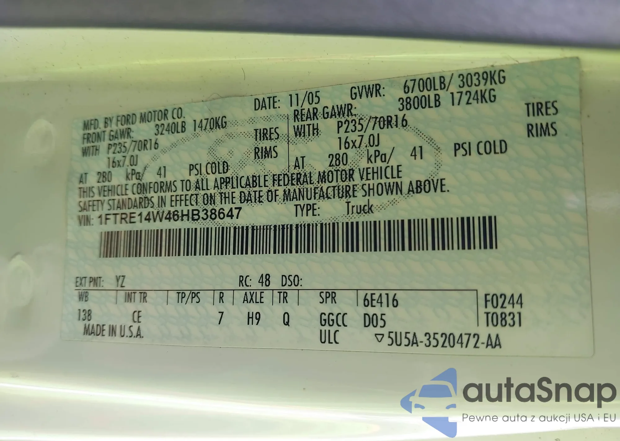 LOT: 39259696 VIN: 1FTRE14W46HB38647