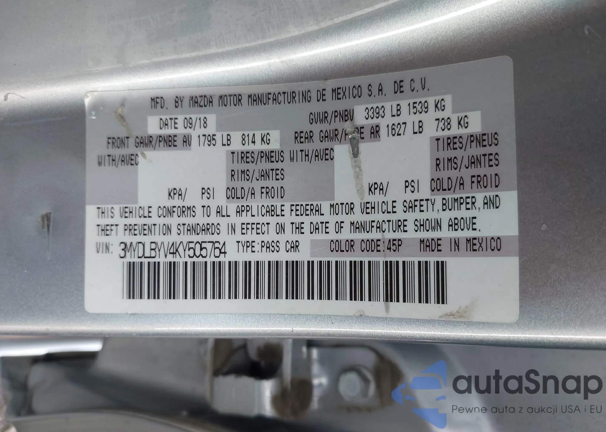 LOT: 43759369 VIN: 3MYDLBYV4KY505764