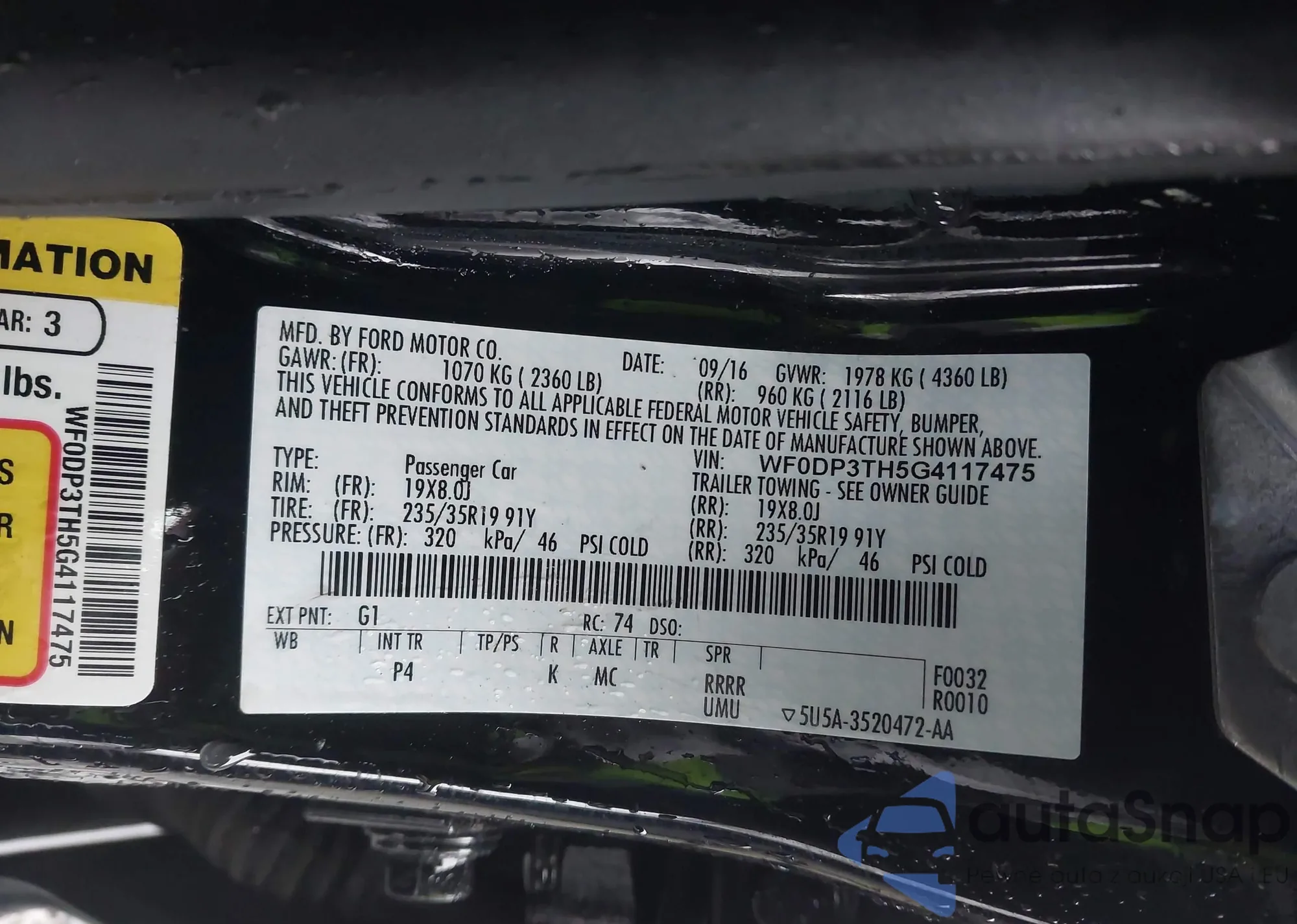 LOT: 43911368 VIN: WF0DP3TH5G4117475