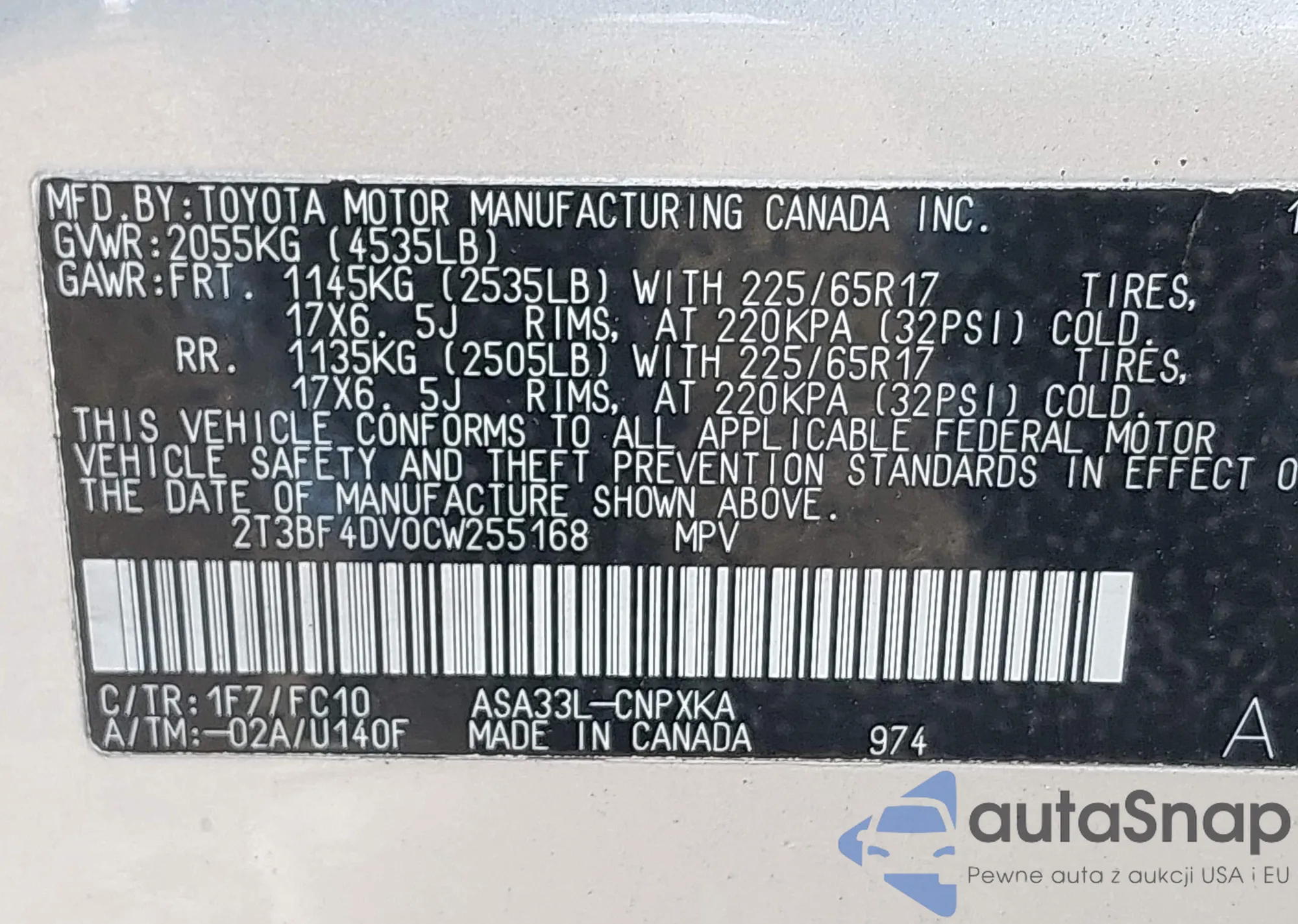 • VIN 2T3BF4DV0CW255168