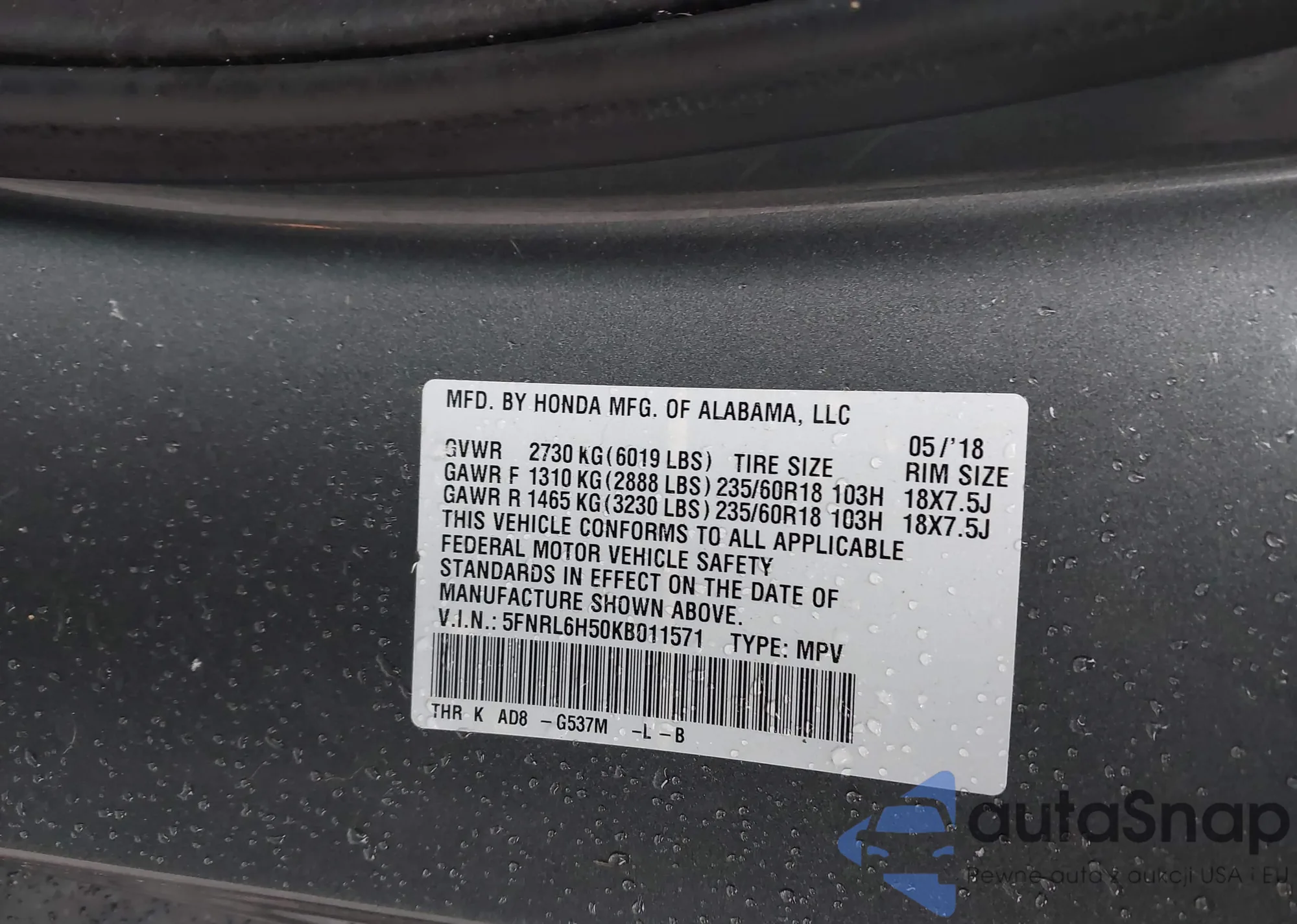 • VIN 5FNRL6H50KB011571