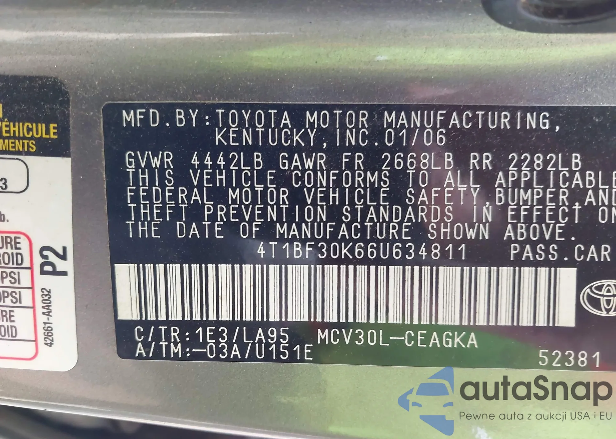 • VIN 4T1BF30K66U634811