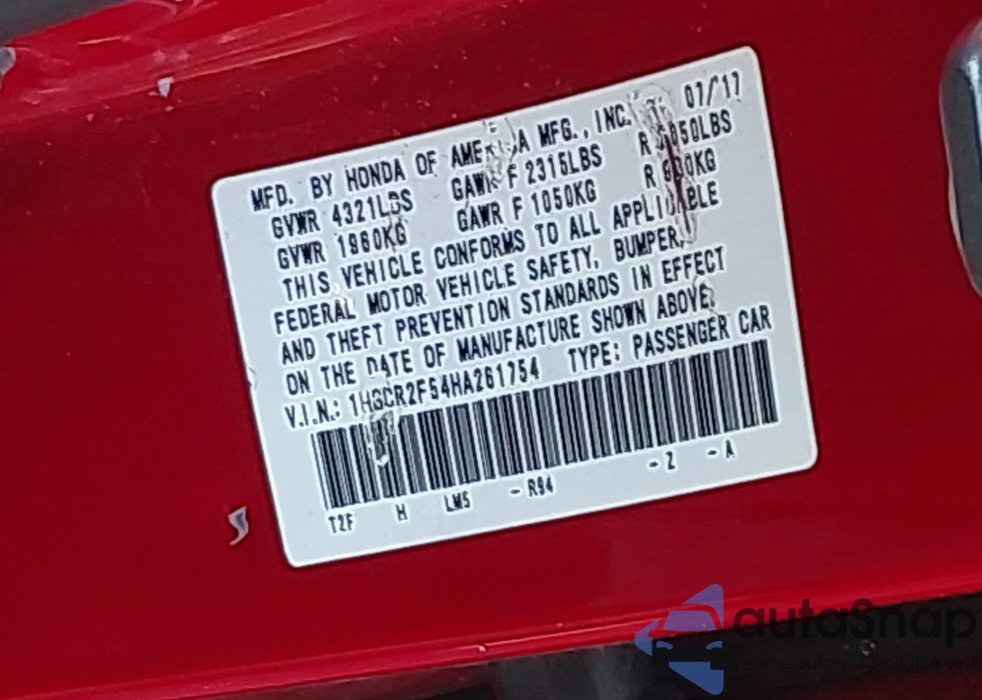 LOT: 43691118 VIN: 1HGCR2F54HA261754