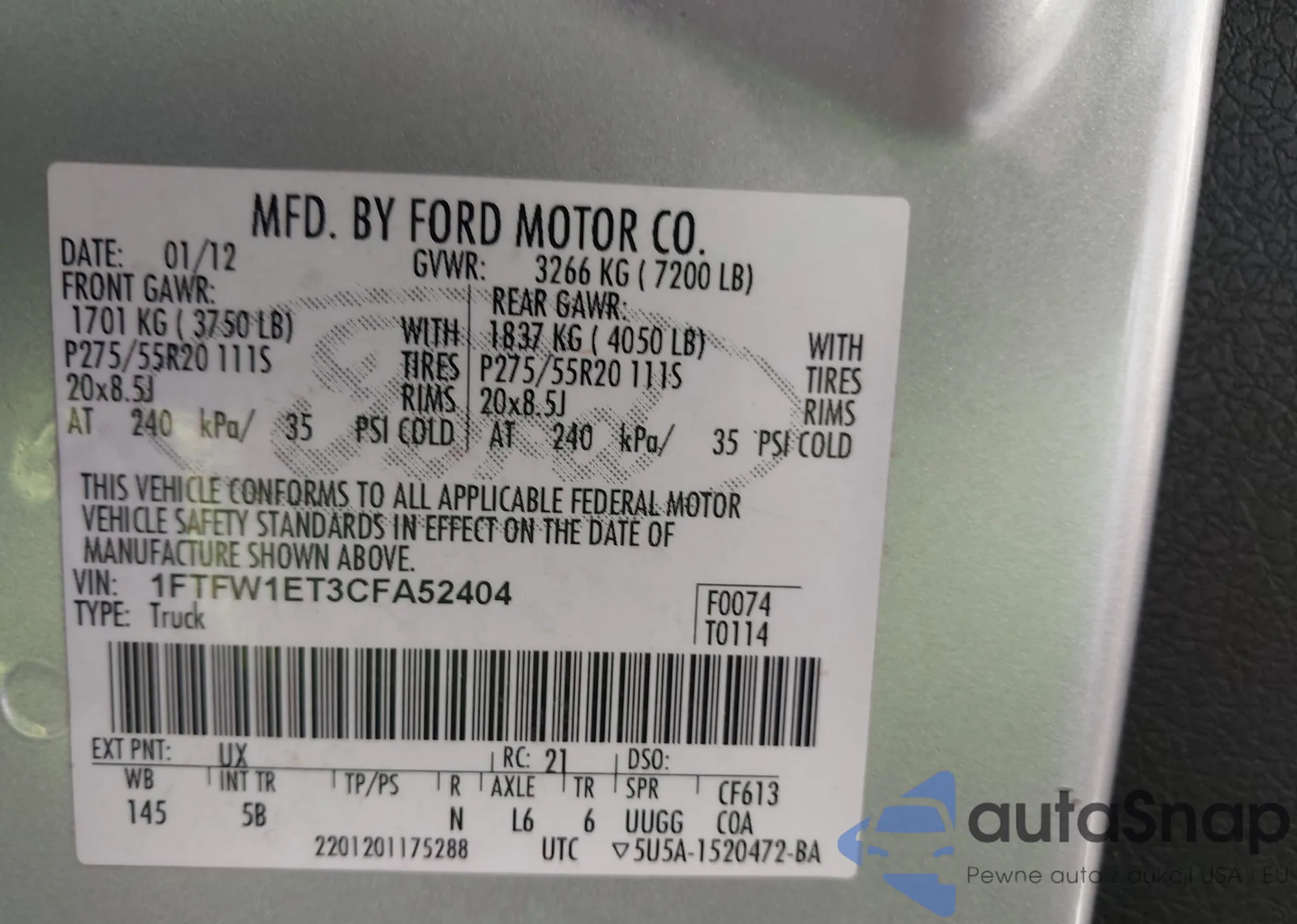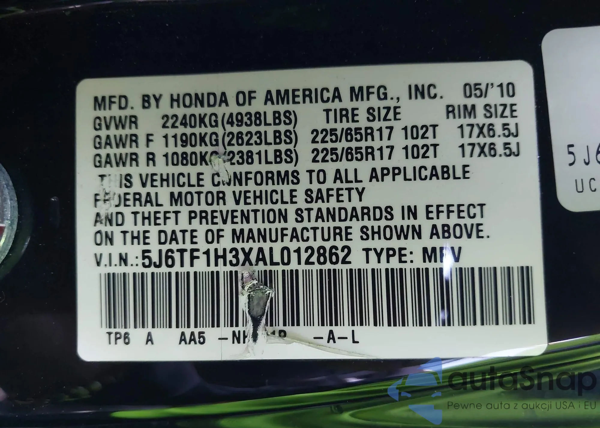 • VIN 5J6TF1H3XAL012862