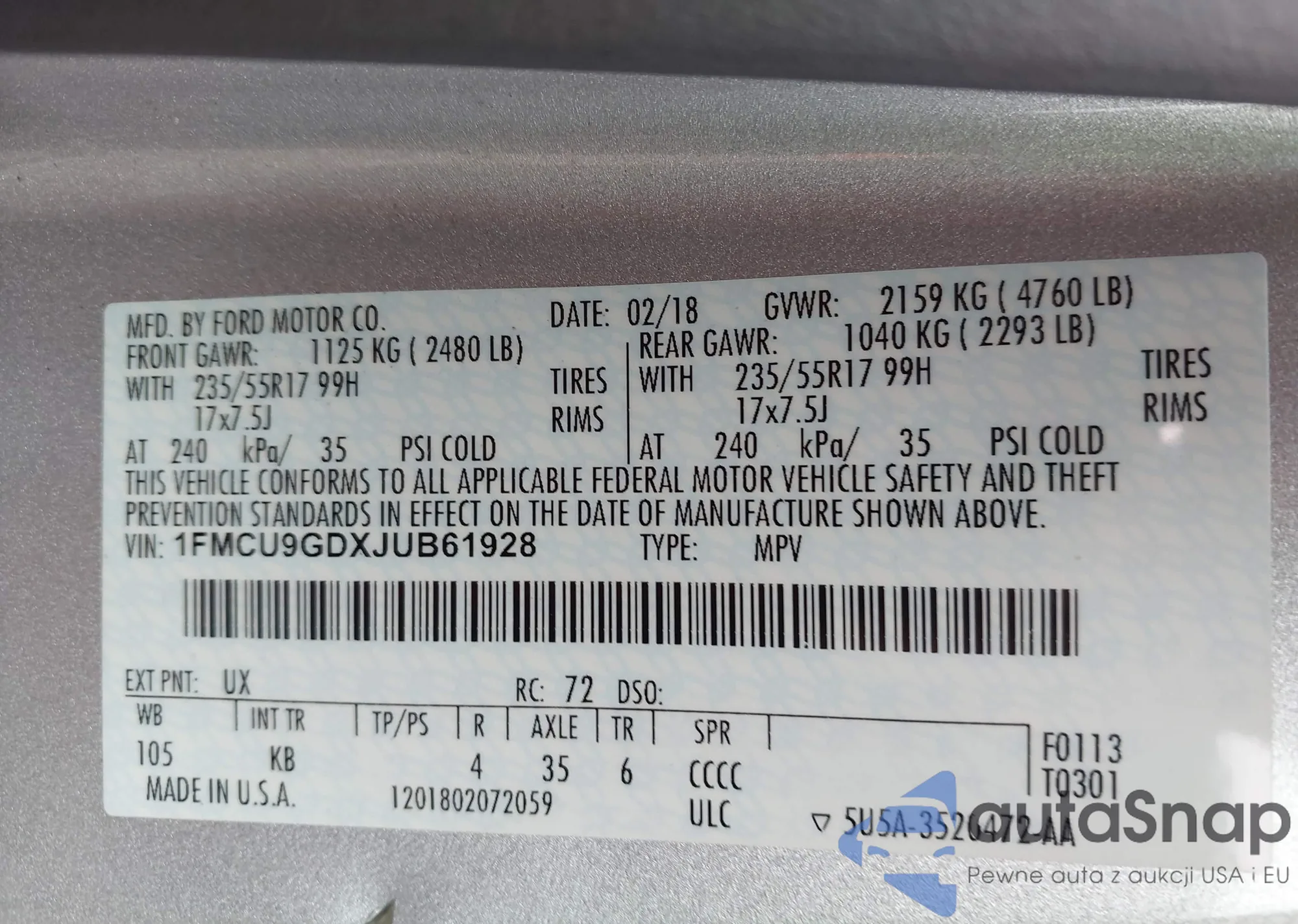 • VIN 1FMCU9GDXJUB61928
