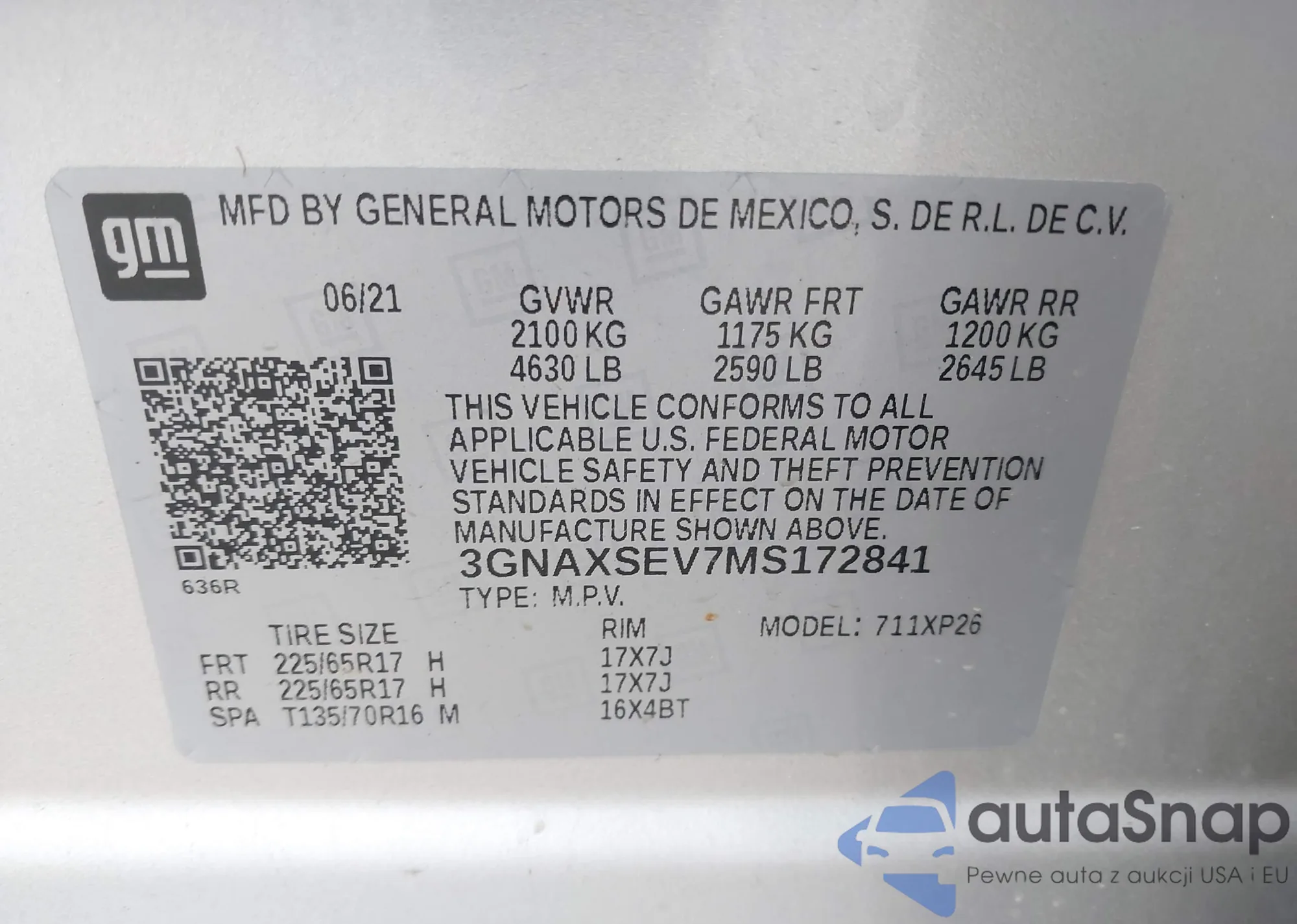 LOT: 43616000 VIN: 3GNAXSEV7MS172841