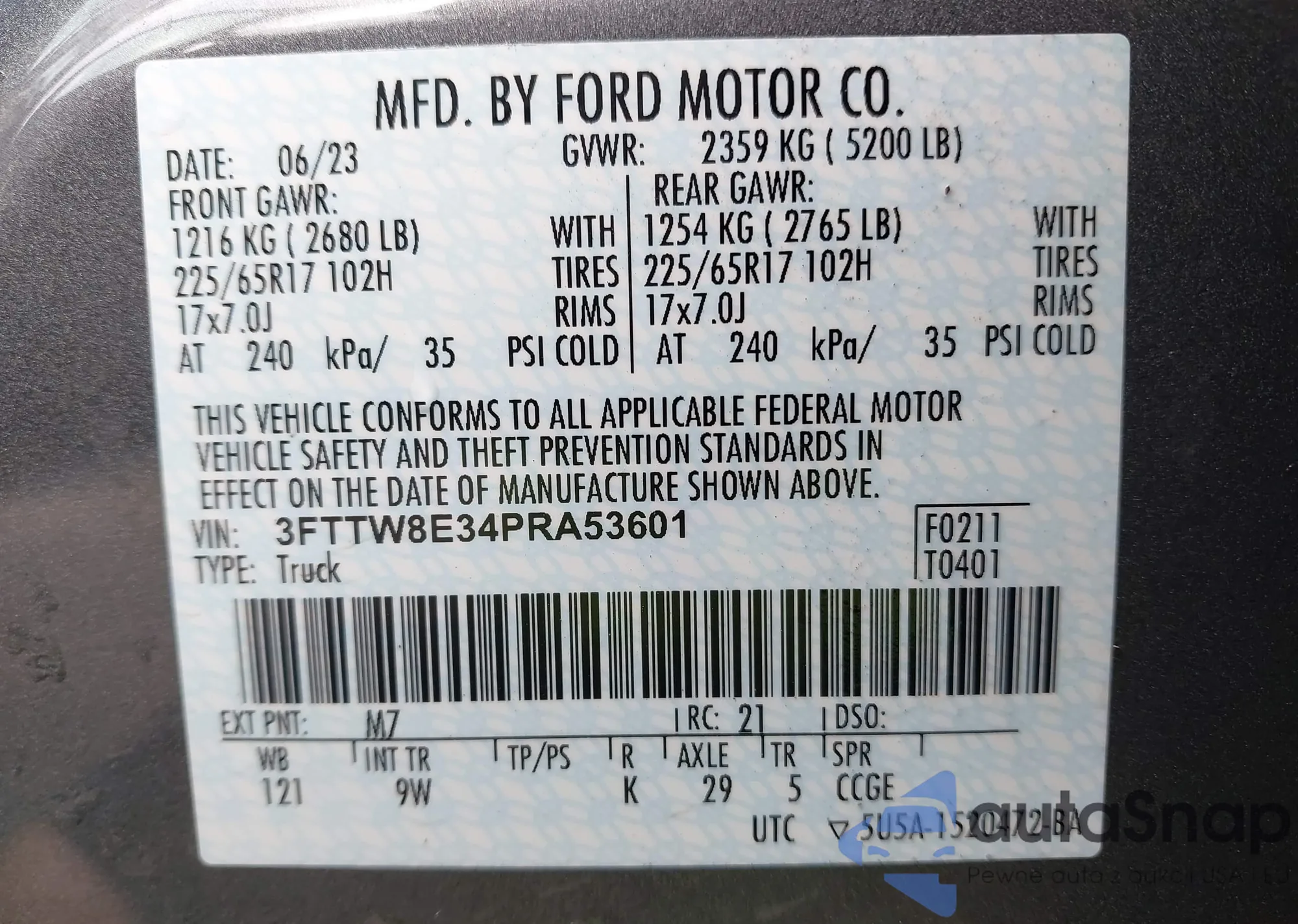LOT: 43648430 VIN: 3FTTW8E34PRA53601