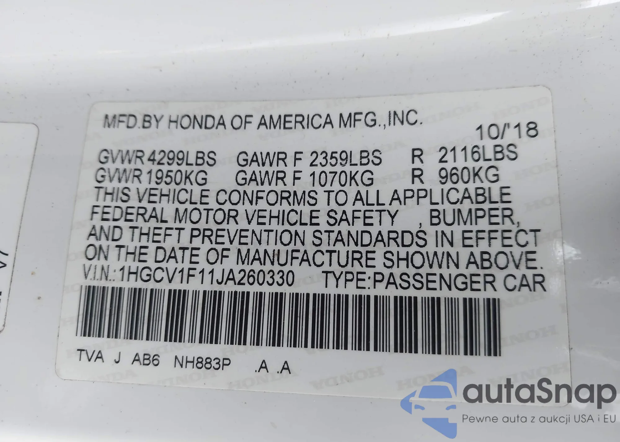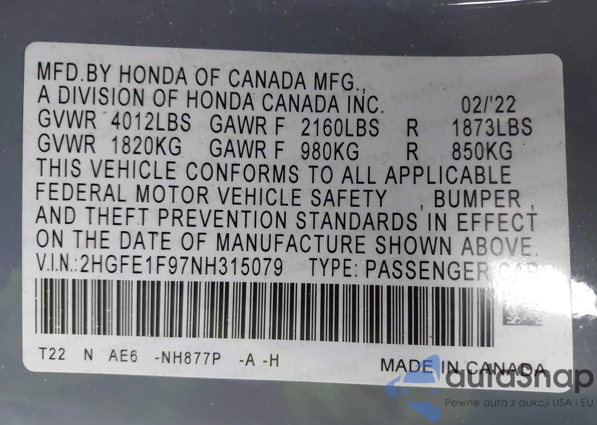 LOT: 43753408 VIN: 2HGFE1F97NH315079