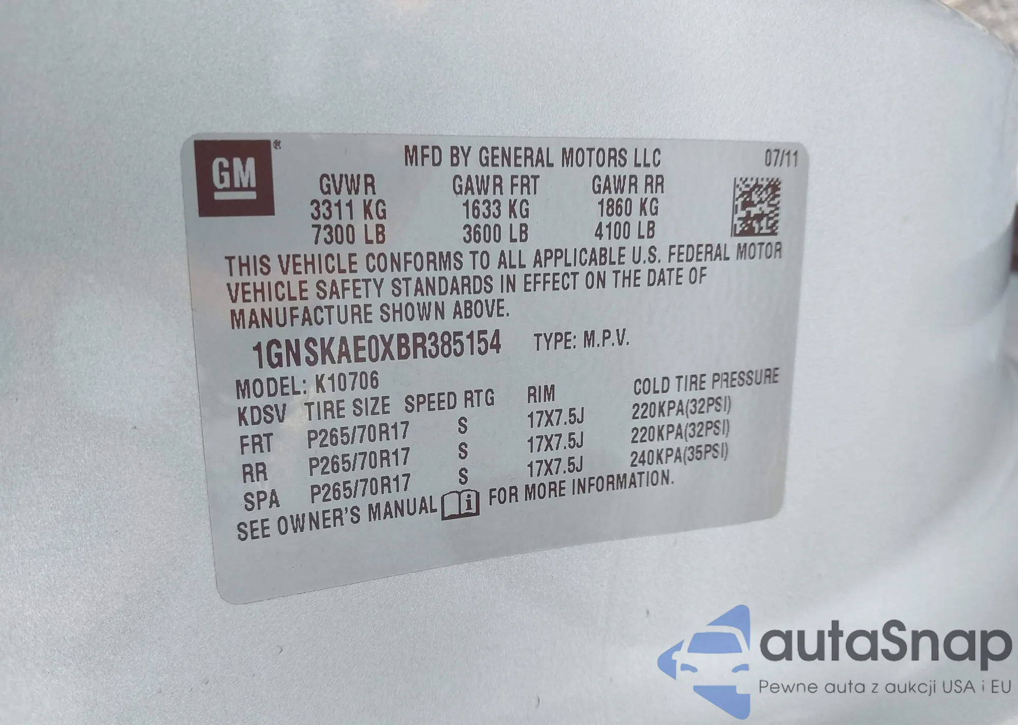 LOT: 43785669 VIN: 1GNSKAE0XBR385154