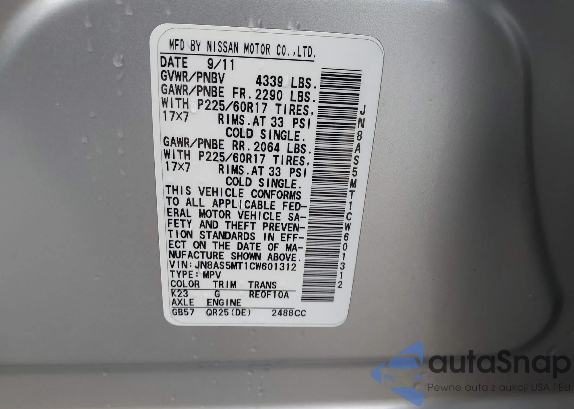 • VIN JN8AS5MT1CW601312