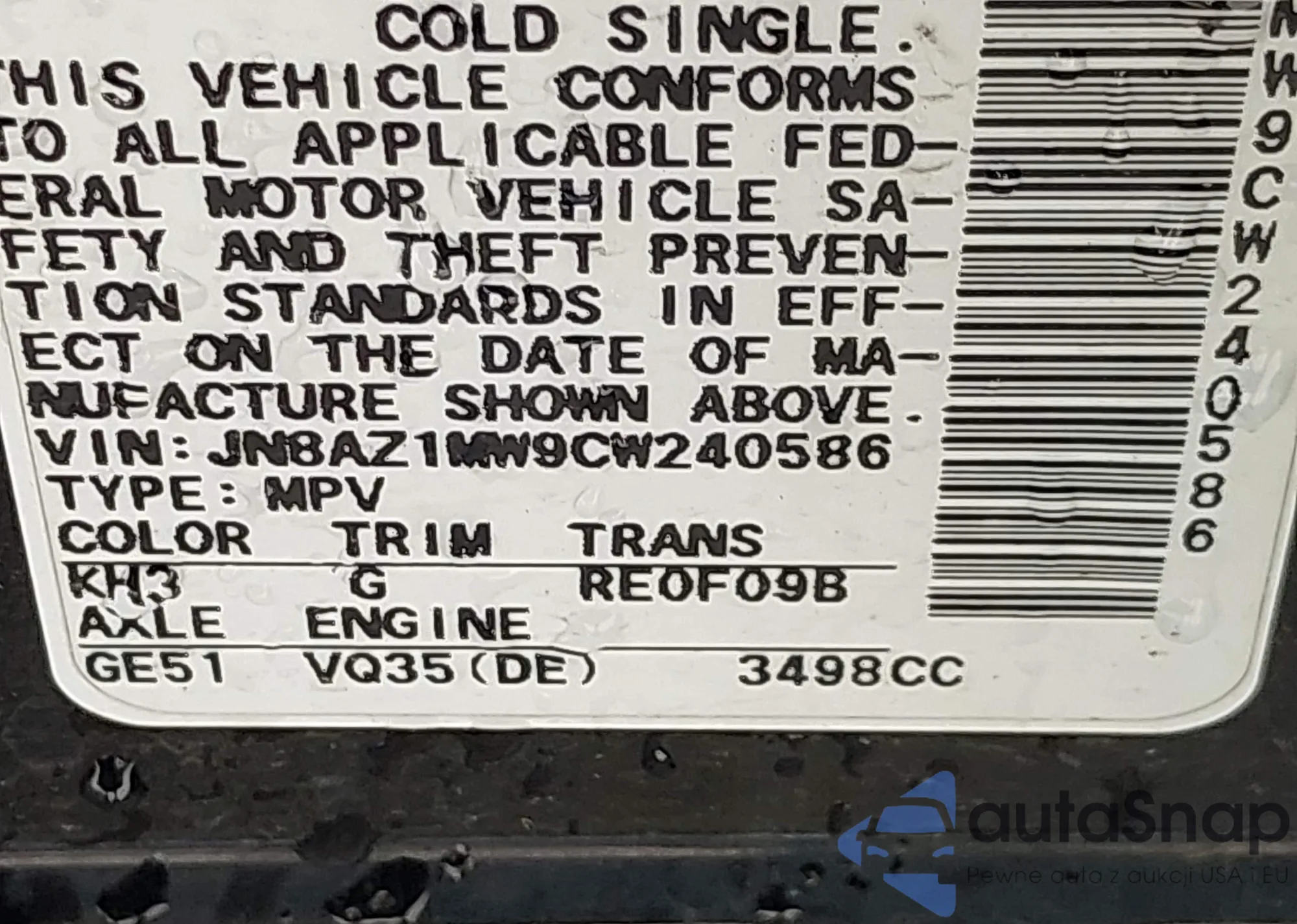 • VIN JN8AZ1MW9CW240586