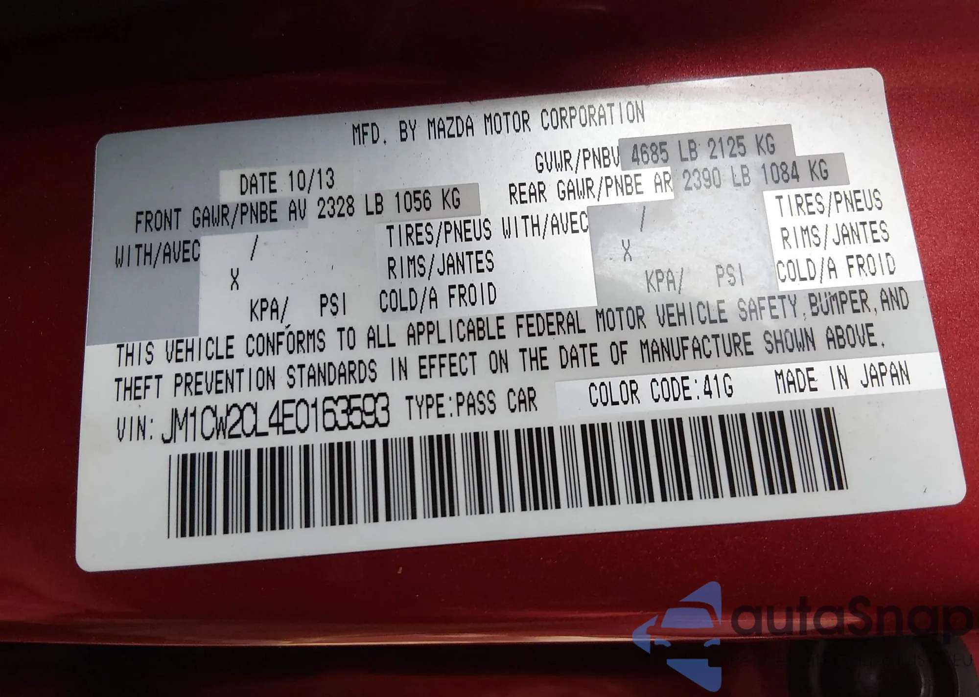 LOT: 43735181 VIN: JM1CW2CL4E0163593