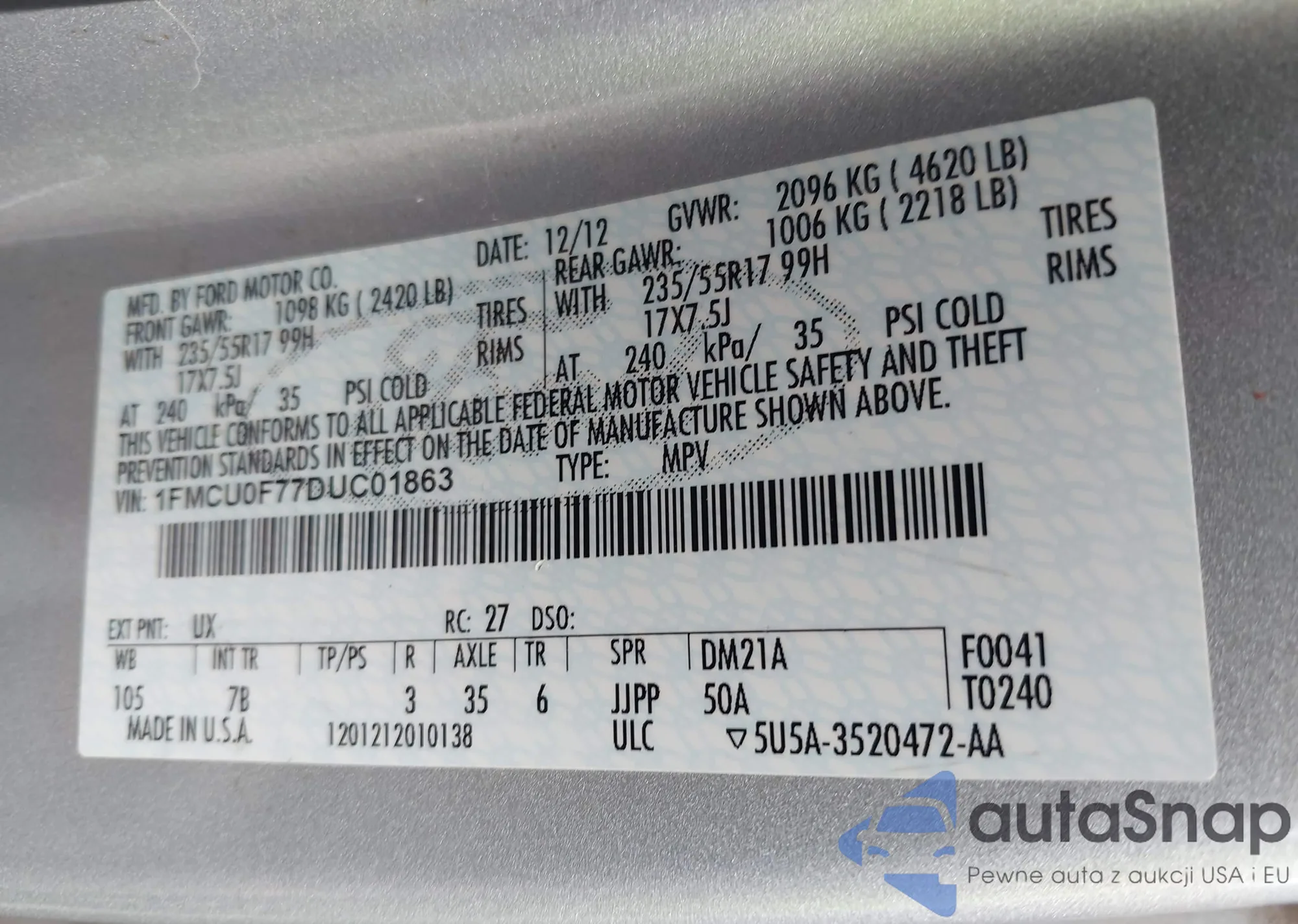 • VIN 1FMCU0F77DUC01863
