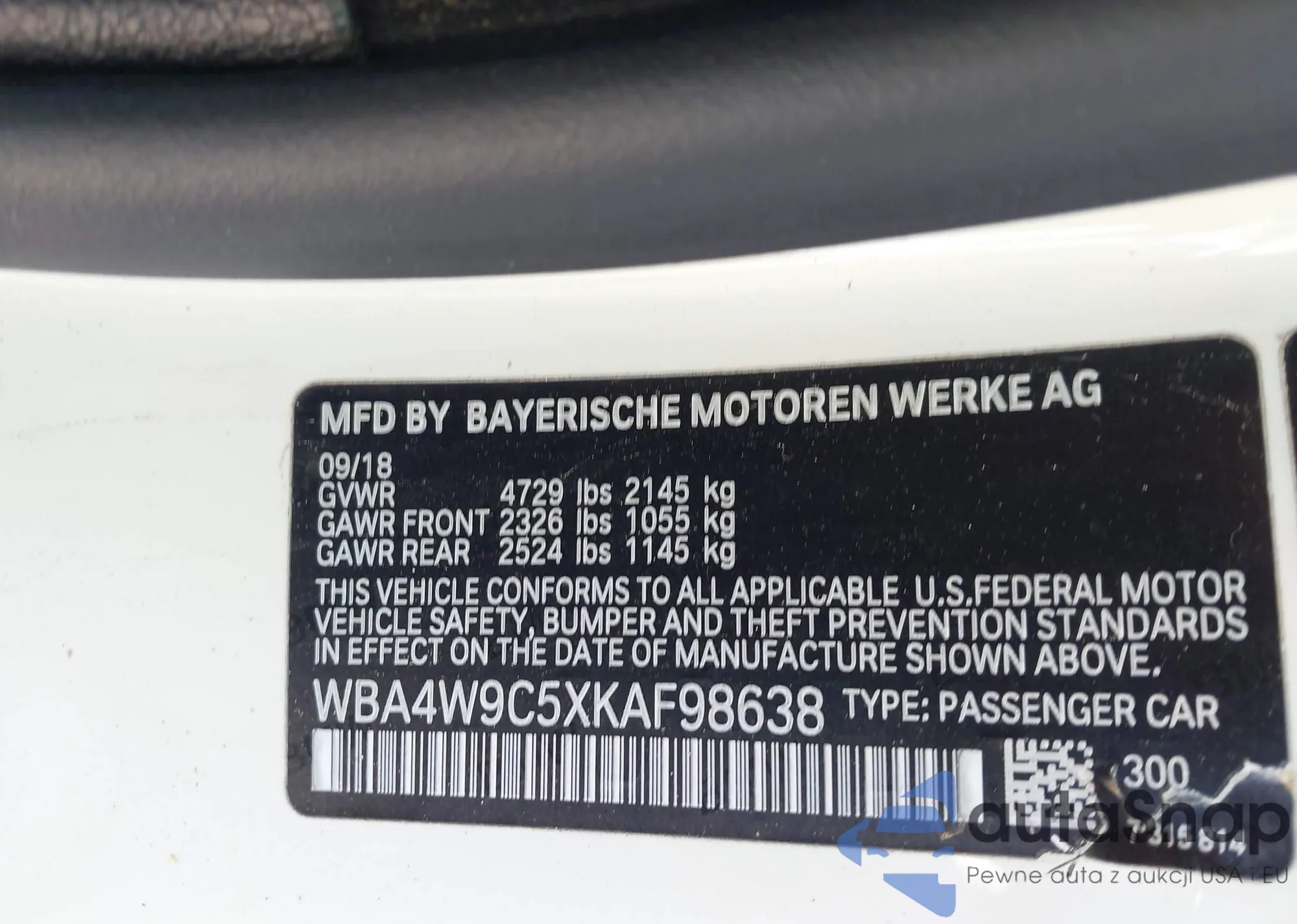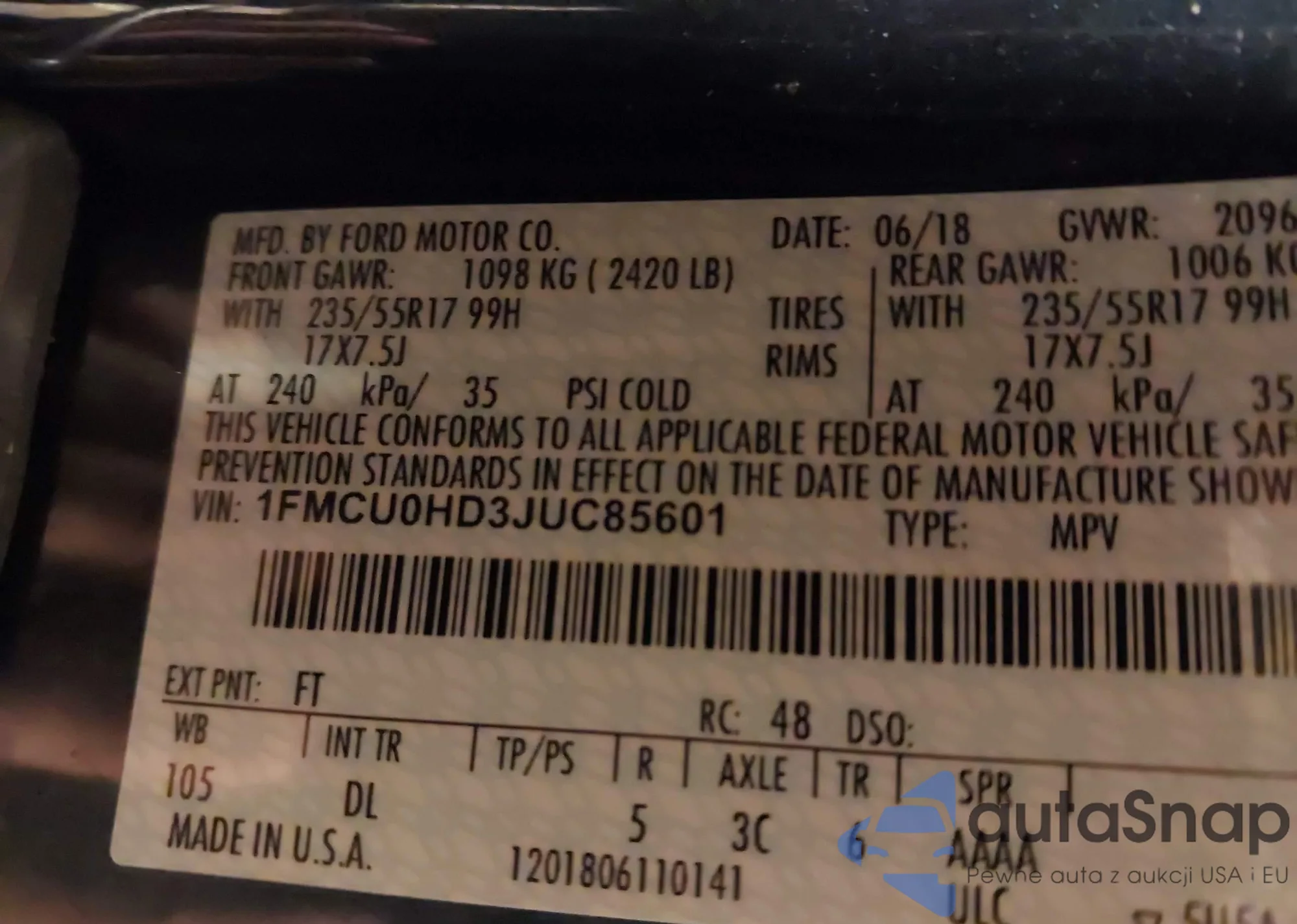 LOT: 43512876 VIN: 55SWF4JB5HU181821