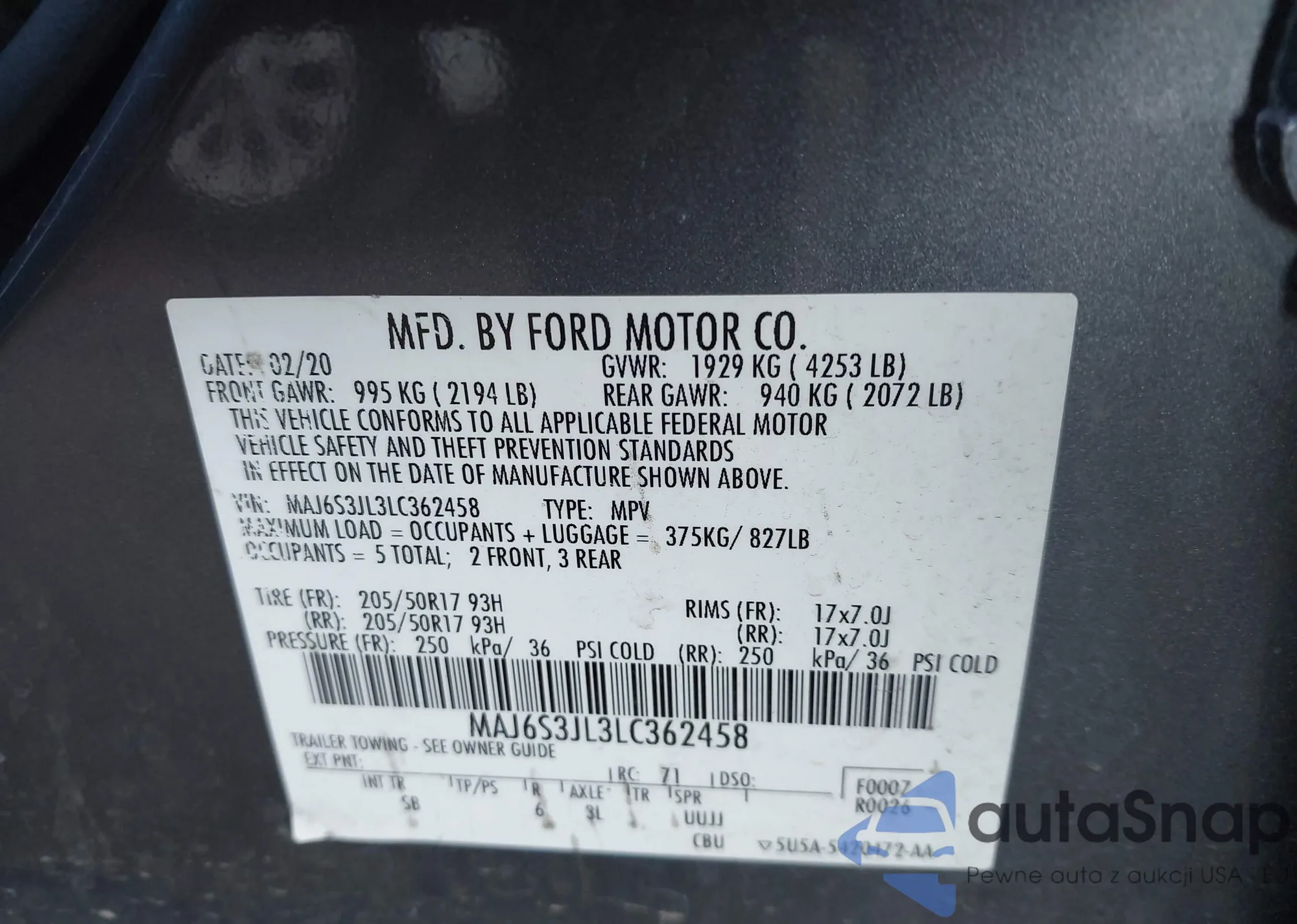 • VIN MAJ6S3JL3LC362458
