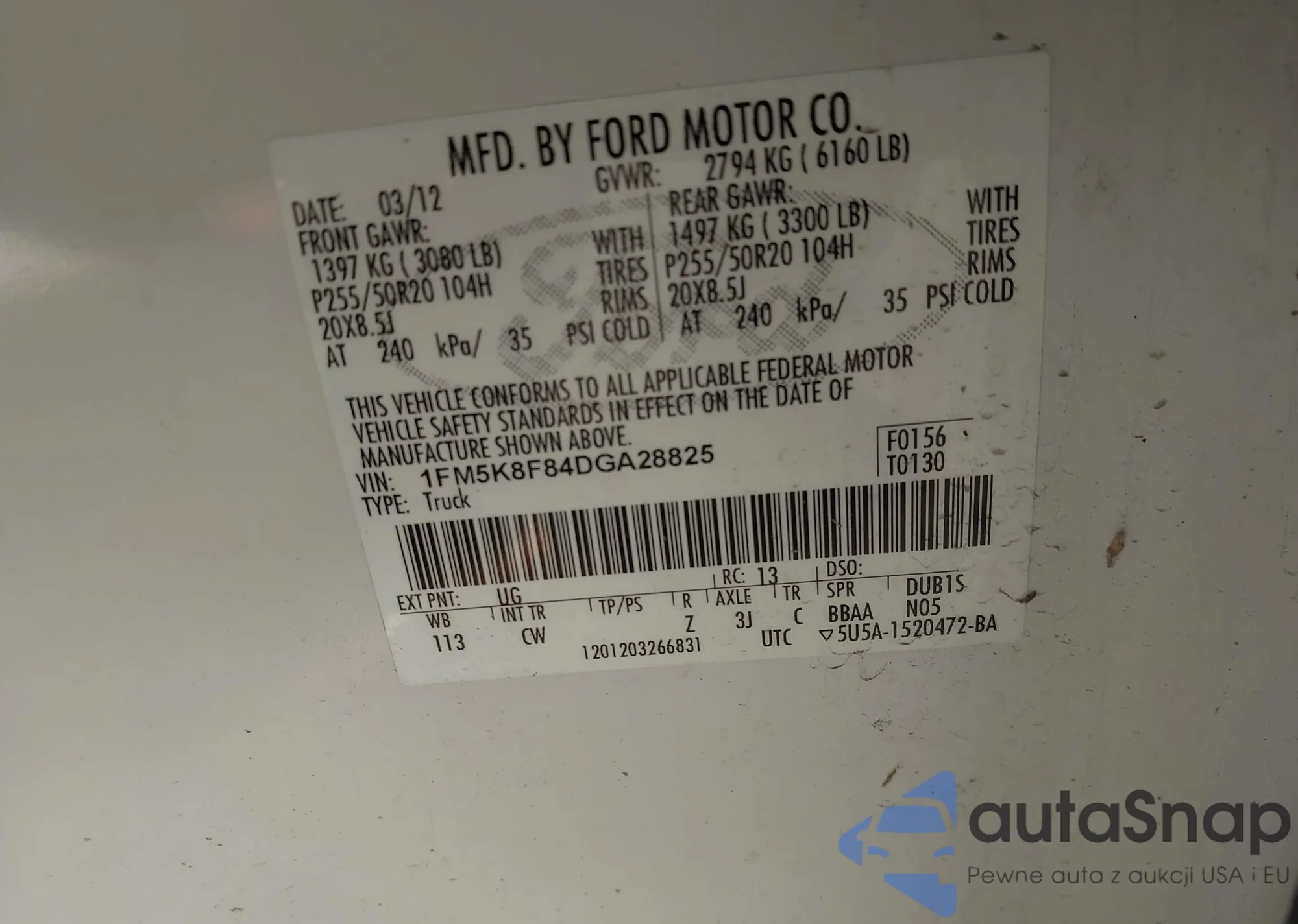 LOT: 43736069 VIN: 1FM5K8F84DGA28825