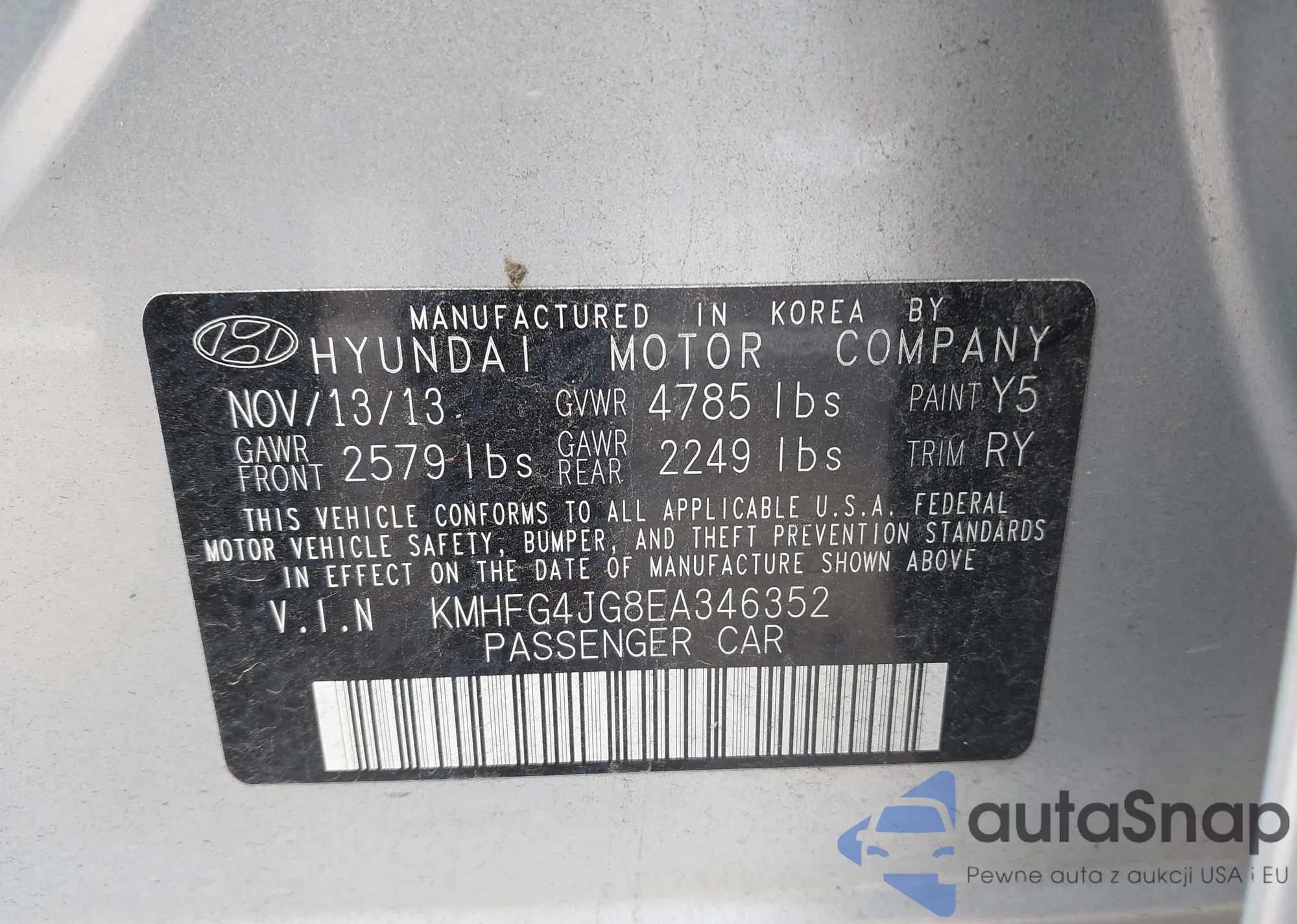 LOT: 43805211 VIN: KMHFG4JG8EA346352