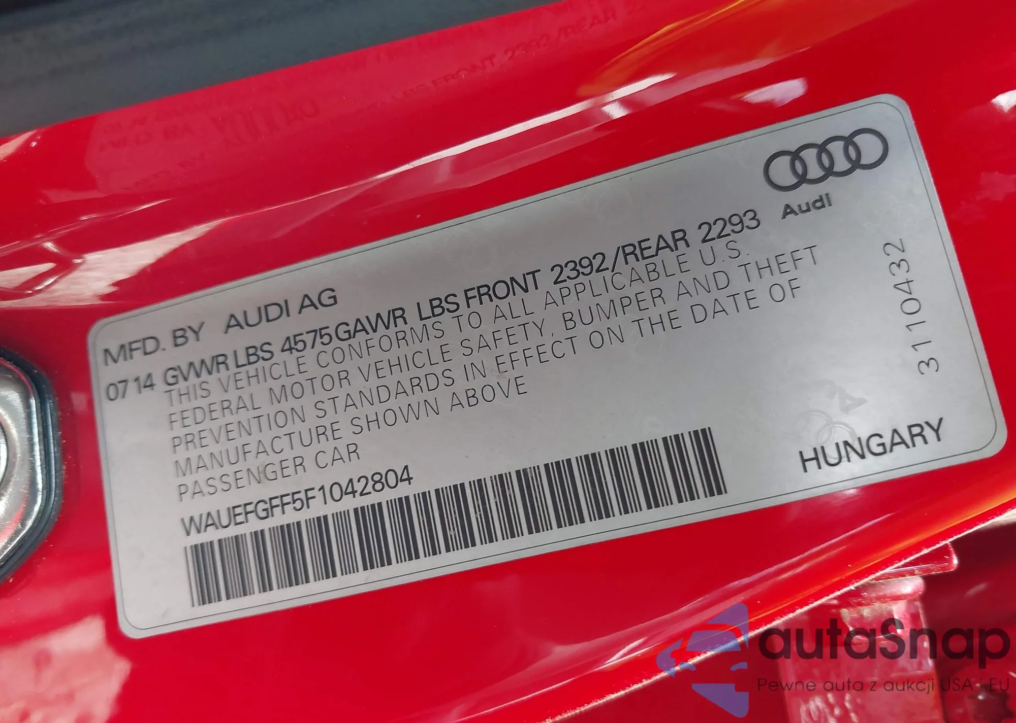 LOT: 42851630 VIN: WAUEFGFF5F1042804