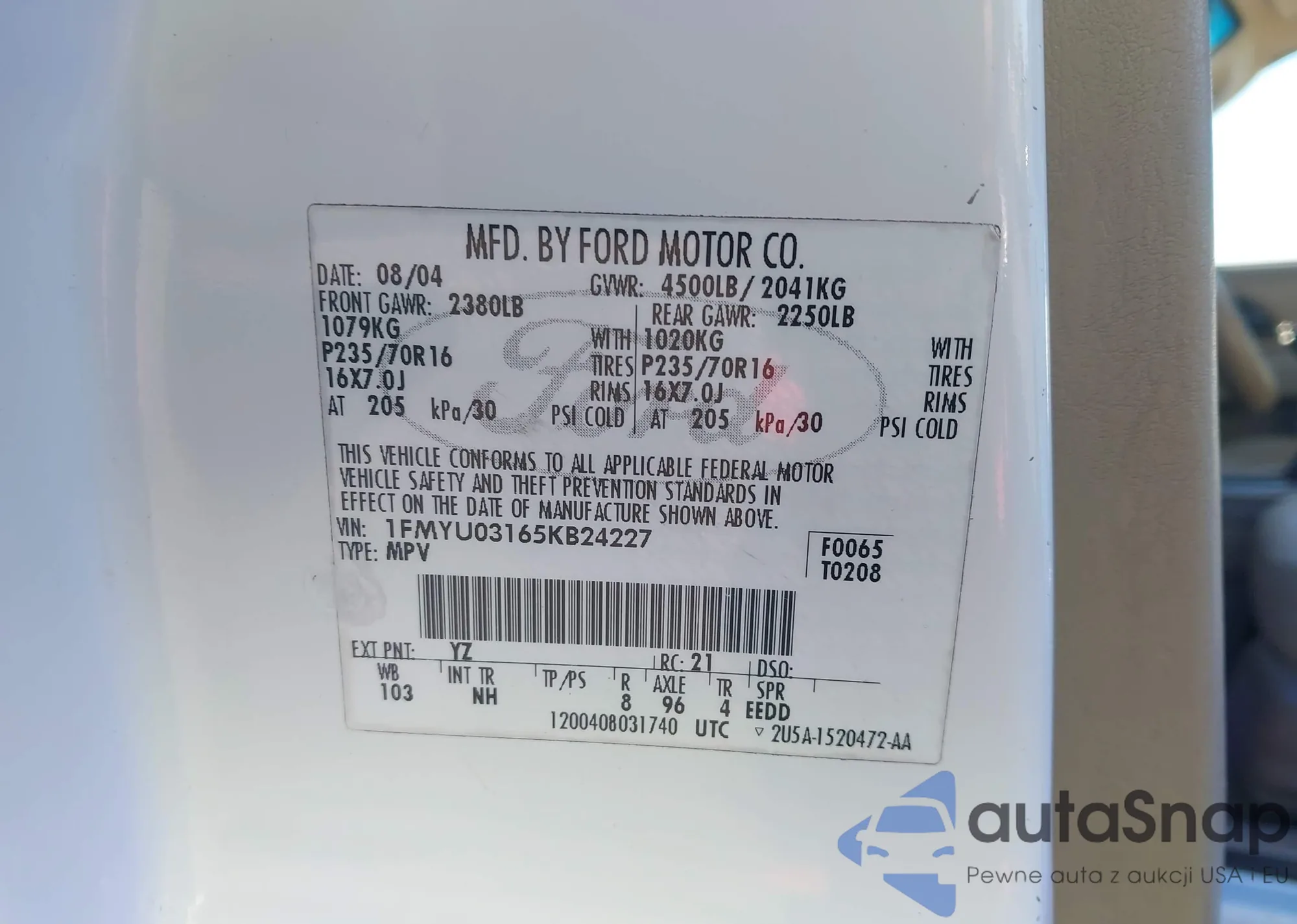 LOT: 43923278 VIN: 1FMYU03165KB24227