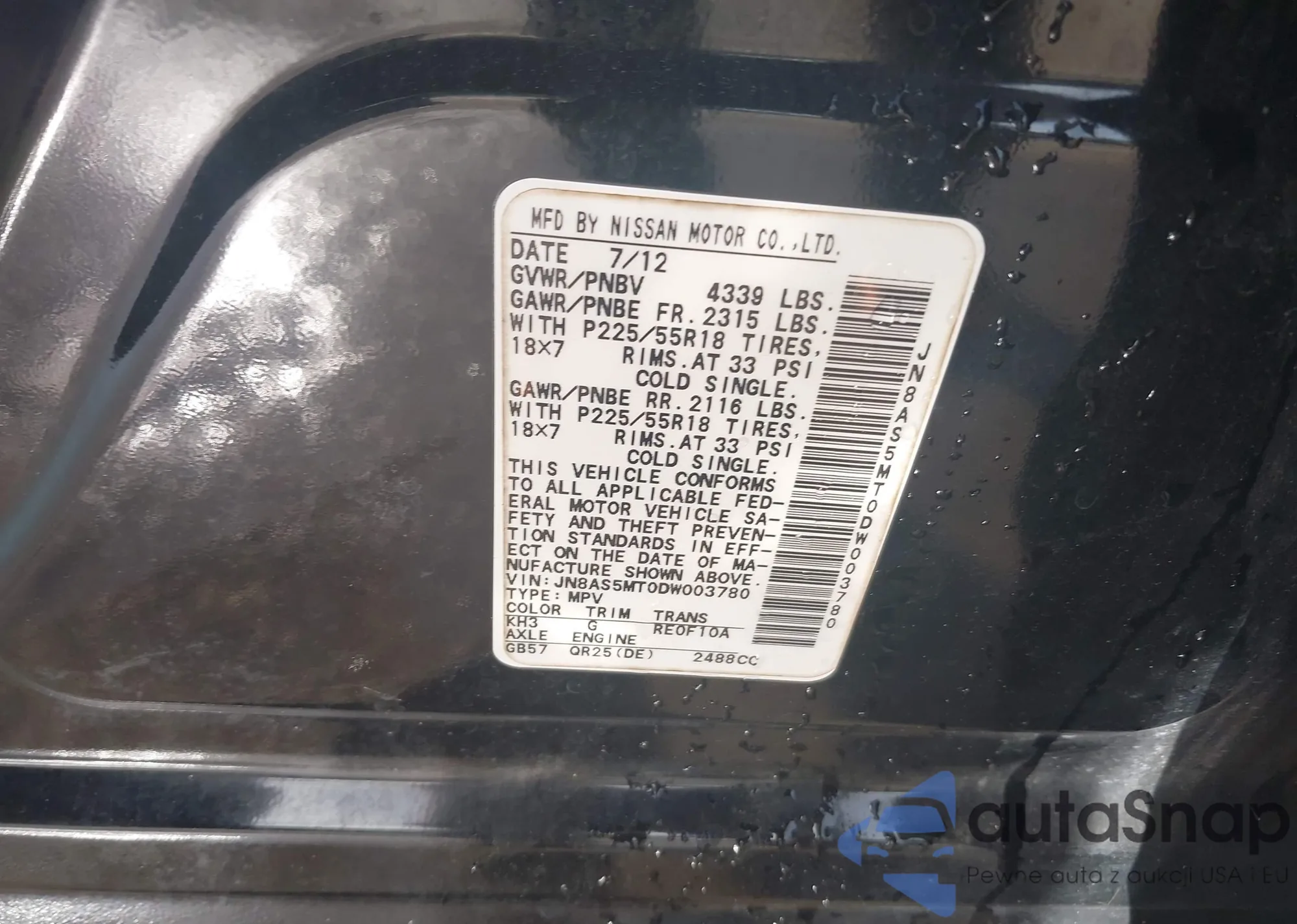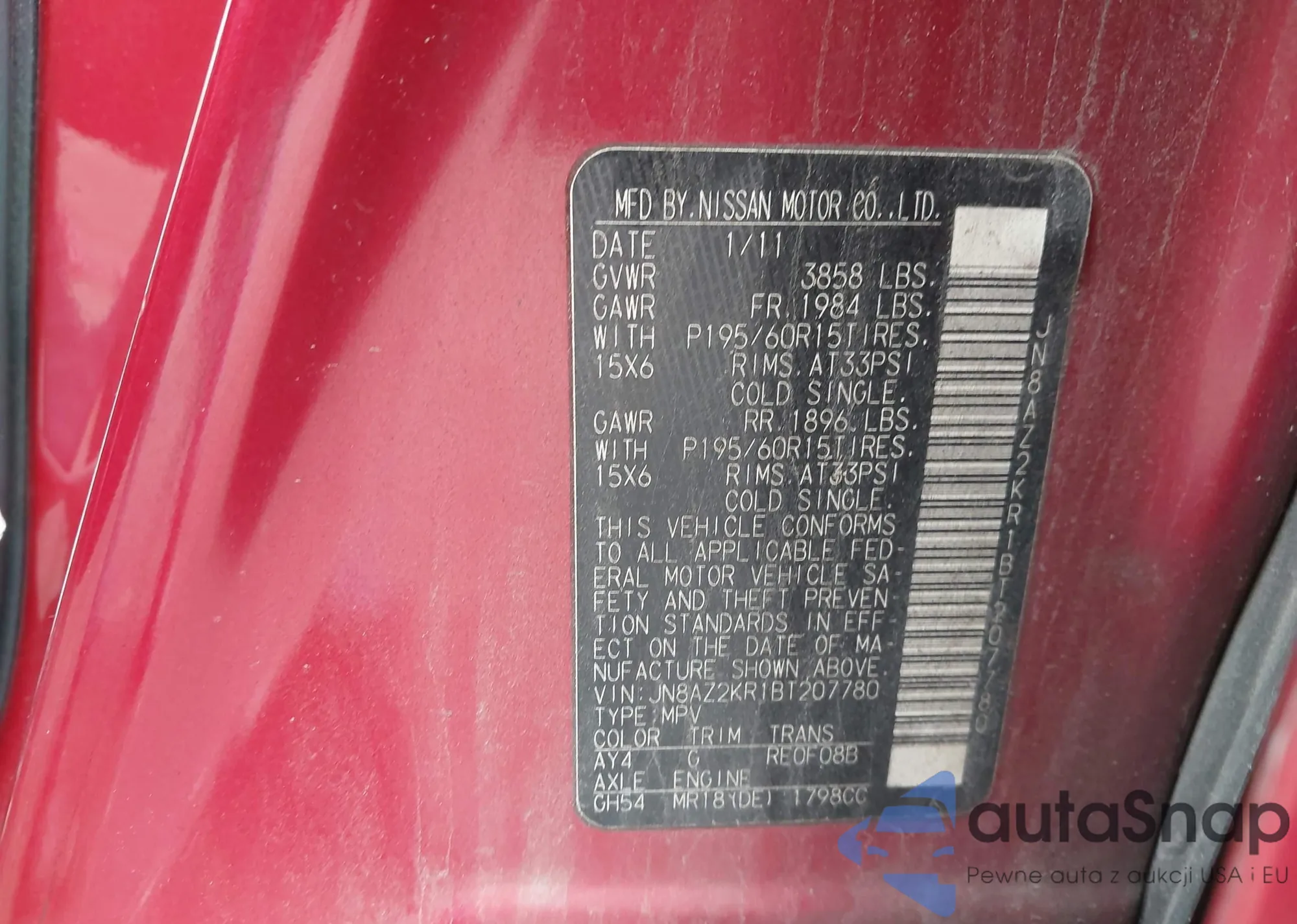 • VIN JN8AZ2KR1BT207780