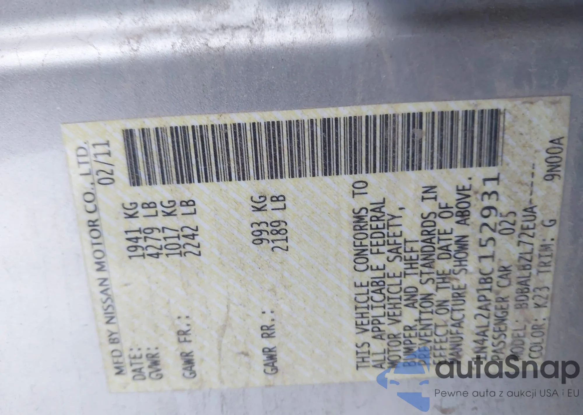 LOT: 43808622 VIN: 1N4AL2AP1BC152931