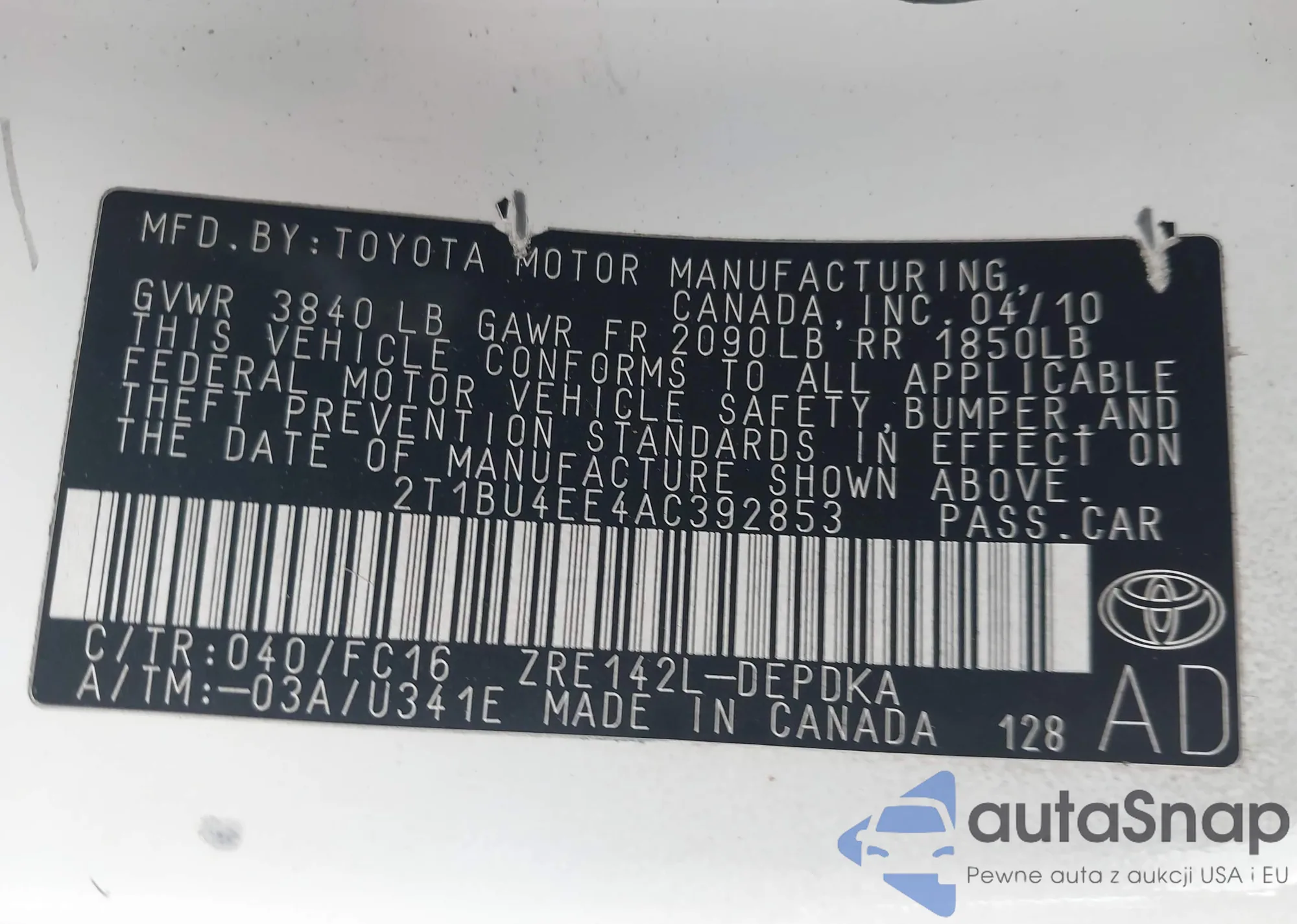 • VIN 2T1BU4EE4AC392853
