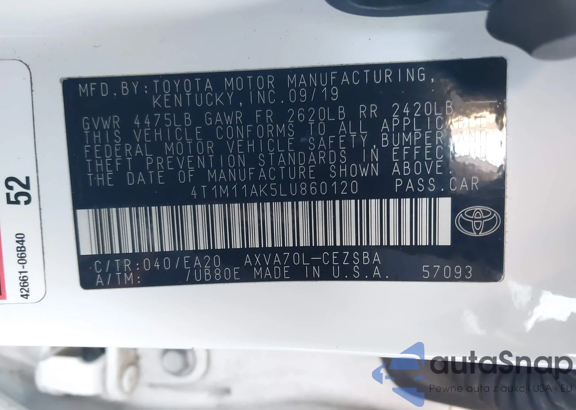 LOT: 43537807 VIN: 4T1M11AK5LU860120